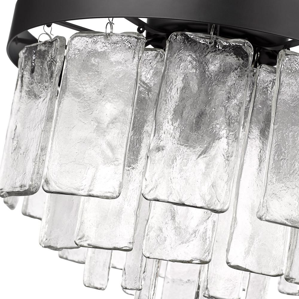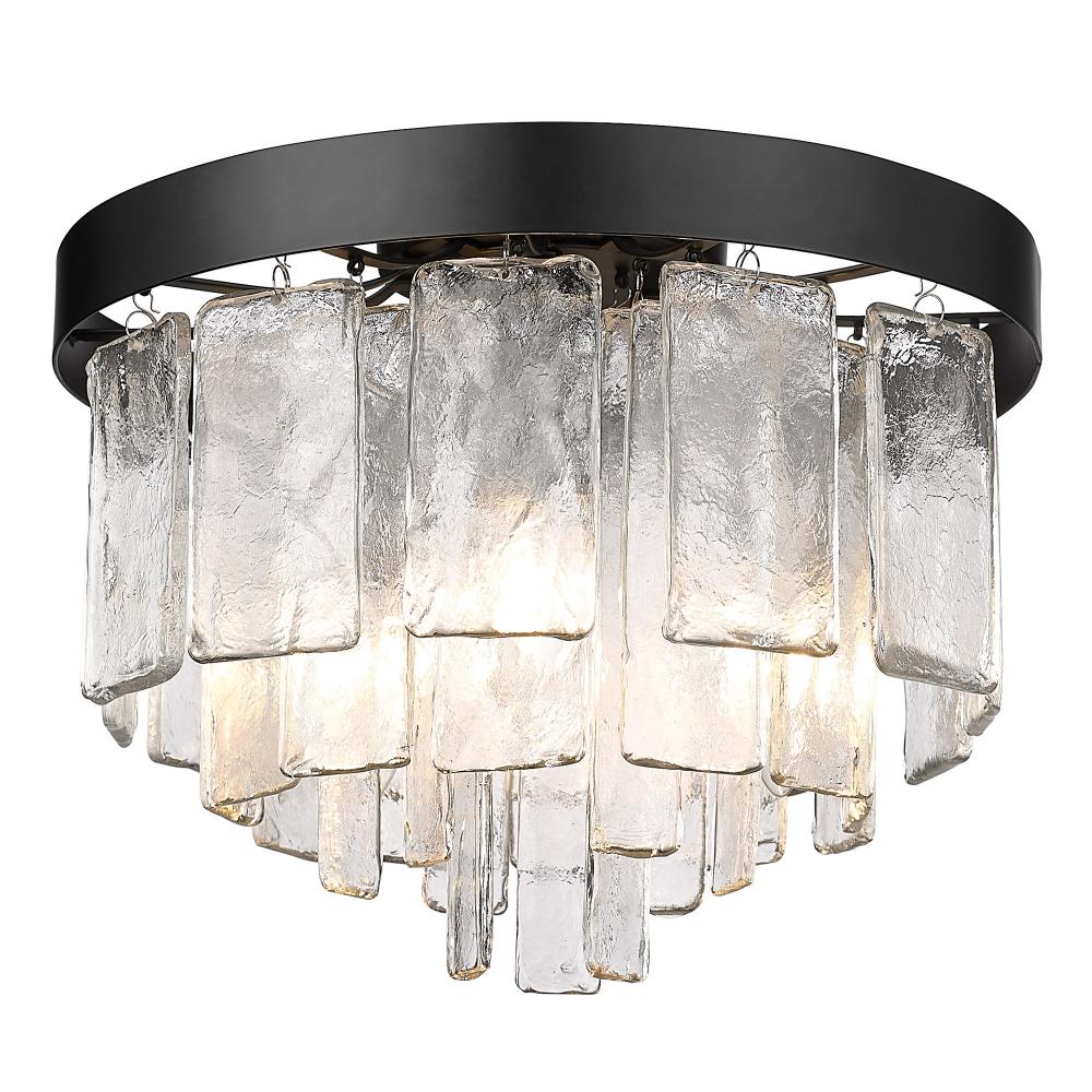 Bring Glam elegance into your home with the Golden Lighting Ciara 3-light Flush Mount. Featuring a glass shade and a matte black frame, it creates a welcoming atmosphere. The flush mount design showcases a stunning hammered water glass shade, which features a unique texture that beautifully distorts and refracts light. This glass captures the dynamic essence of both ice and water, creating intricate light patterns and a dazzling glow. The matte black finish is timeless and versatile, offering a smooth, sophisticated look that complements any decor—ranging from industrial to contemporary styles. Ideal for low ceilings in hallways, closets, laundry areas, and bathrooms, this fixture is damp location rated, making it suitable for covered and semi-enclosed spaces with occasional moisture. It requires 3 E12 candelabra base bulbs (not included) with a maximum wattage of 60 per bulb, providing ample illumination for various settings. Overall dimensions of 13"W x 10"H x 13"D ensure compact design meets wide illumination. Customers appreciate its easy assembly and installation, noting its quality and perfect fit for diverse spaces, from a media room to a kitchen closet.