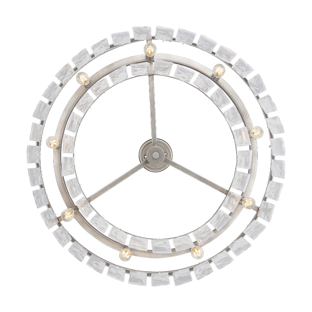 Bring glam elegance into your home with the Golden Lighting Ciara 9-light Chandelier. Featuring a glass shade and a Peruvian Silver frame, it creates a welcoming atmosphere. The glass shade employs a Hammered Water Glass, offering a distinct surface texture that artfully distorts and refracts light, making each moment uniquely illuminated. With elements reminiscent of frozen streams, it adds a touch of organic beauty and radiance to your setting. The Peruvian Silver finish captures a rustic elegance with its weathered tones and artisanal feel, perfect for complementing your home decor with a sophisticated touch. Ideal for dining rooms and foyers, this chandelier is Damp Location Rated, making it suitable for covered or semi-enclosed spaces. Its Convertible Design allows for flexible installation as either a semi-flush mount or pendant, with an Adjustable Height of 10.125" to 55". Overall Dimensions: 27"W x 10.13"H x 27"D. Requires 9 E12 Candelabra base bulbs (not included) with a maximum of 60 watts per bulb. Elevate your interior with a statement fixture that seamlessly blends artistry and elegance, designed to enhance your living spaces.