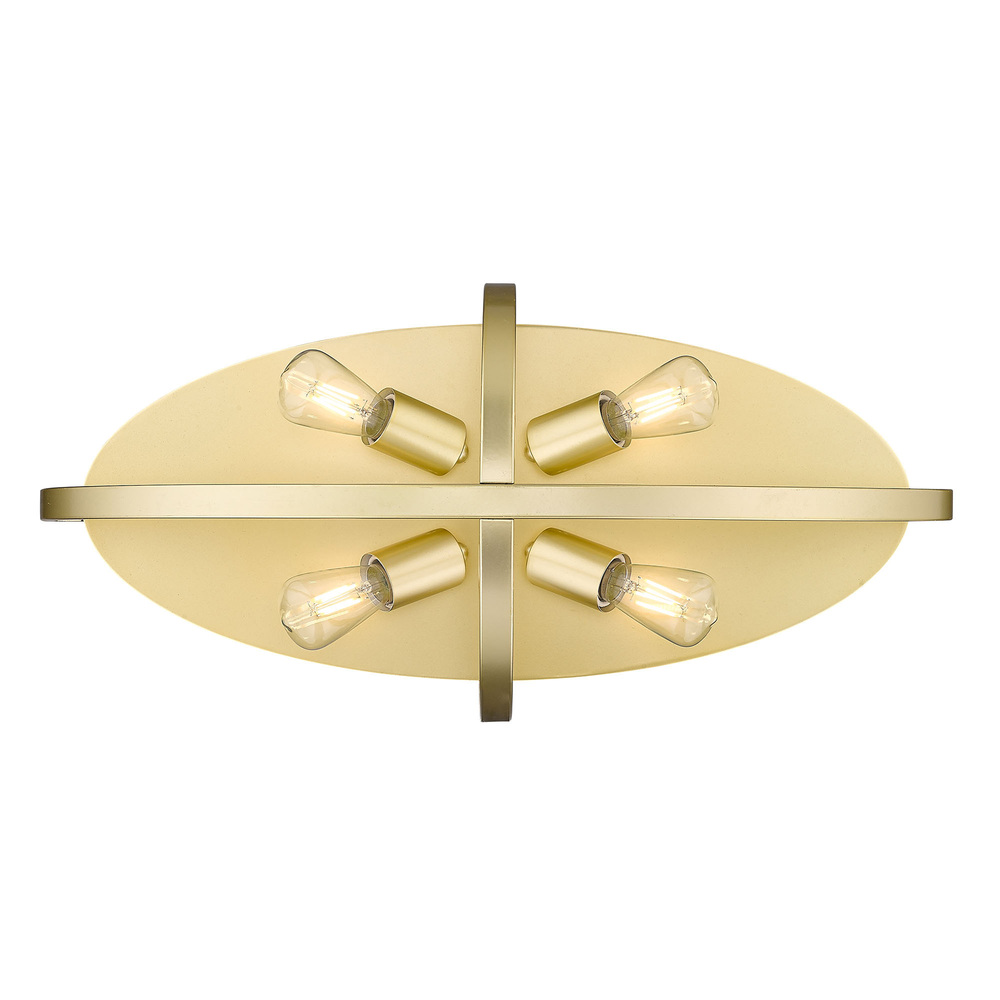 Bring Transitional elegance into your home with the Golden Lighting Colson 4-light Flush Mount in Olympic Gold. This stunning fixture creates a welcoming atmosphere with its grand scale and luminous design. The fixture features a clean, open-orb frame that enhances the classic candelabra, creating a substantial focal point without sacrificing valuable headspace. Its Olympic Gold finish, with a soft, pale hue and chalky matte surface, beautifully diffuses light, adding warmth and contemporary sensibility to any space. Ideal for low ceilings, this fixture is rated for damp locations, making it suitable for covered or semi-enclosed spaces like bathrooms and laundry areas. With overall dimensions of 23.13"W x 7.88"H x 11.25"D, it requires 4 E26 Medium base bulbs (not included), with a maximum of 60 watts per bulb, ensuring powerful illumination. Enhance your home with this stunning piece that offers the perfect balance of style and functionality, reflecting high-quality craftsmanship in every detail.