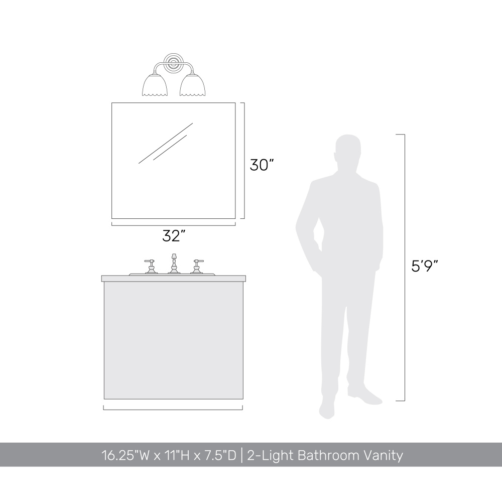 Bring a touch of luxury into your bathroom with the Golden Lighting Dorinda 2-light Vanity. Featuring two glass shades and a Brushed Champagne Brass frame, it delivers a welcoming atmosphere. The opal glass shades are designed to diffuse light evenly, creating a beautiful, glare-free glow that flatters any space. With its elegant Brushed Champagne Brass finish, this vanity light exudes sophistication, seamlessly blending the warmth of brass with a soft sheen to enhance contemporary interiors. Ideal for providing task lighting in bathrooms, this fixture is damp location rated, making it suitable for areas with occasional moisture. Overall Dimensions: 16.25"W x 11"H x 7.5"D, and it requires 2 E26 medium base bulbs (not included), max 100 watts per bulb. Elevate your bathroom experience with this stylish and functional vanity light fixture.