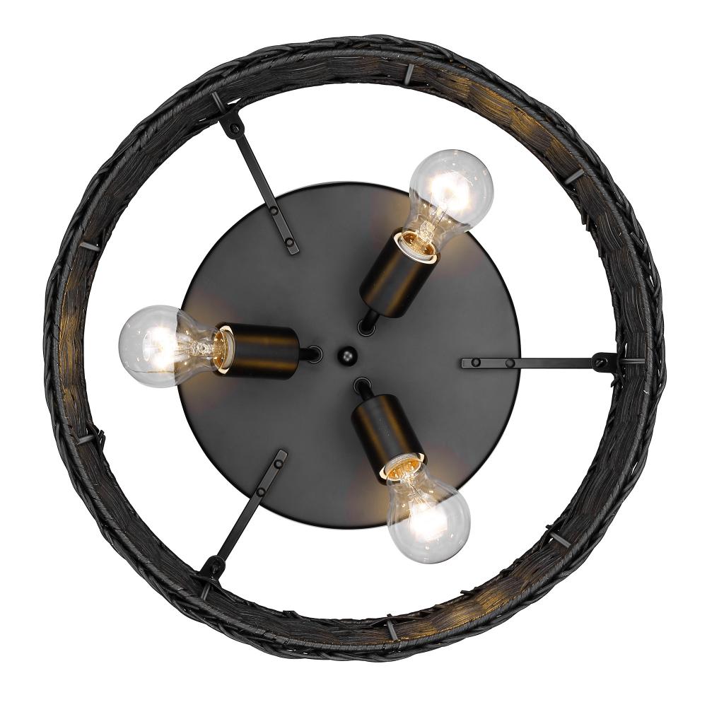 Embrace modern elegance with the Golden Lighting Erma 3-light Flush Mount. Featuring a wicker shade and a matte black frame, it creates a welcoming atmosphere. The black wicker shade offers a sophisticated texture, meticulously handcrafted to create a bold and inviting glow, while the matte black finish adds a timeless touch with its smooth, non-reflective surface. Ideal for low ceilings in hallways, closets, bathrooms, and other compact spaces, this fixture is damp location rated, suitable for areas with occasional moisture. Requires 3 E26 Medium base bulbs (not included), max 60 watts per bulb. Overall dimensions are 16.38"W x 7.5"H x 16.38"D. Elevate your decor with this stylish light fixture that perfectly balances elegance and practicality.