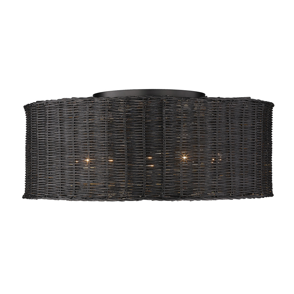 Bring modern elegance into your home with the Golden Lighting Erma 5-light Flush Mount. Featuring a Wicker shade and a Matte Black frame, it creates a welcoming atmosphere. The hand-woven wicker shade offers a charming texture that enhances the light with a warm glow, catching the eye with its unique design. This sophisticated shade features a solid, deep black color and a soft satin sheen, adding depth and inviting warmth. The epitome of clean, modern style, the Matte Black finish is timeless and versatile, providing a smooth touch and a sophisticated look. Ideal for low ceilings in hallways, closets, laundry areas, and bathrooms, this fixture is Damp Location Rated, ensuring safety in spaces with occasional moisture. Installation is hassle-free with a compact design that provides wide illumination. Overall Dimensions: 22.38"W x 9.25"H x 22.38"D, and it requires 5 E26 Medium base bulbs (not included) with a maximum wattage of 100 per bulb. Elevate your living spaces with the graceful charm of the Golden Lighting Erma 5-light Flush Mount.