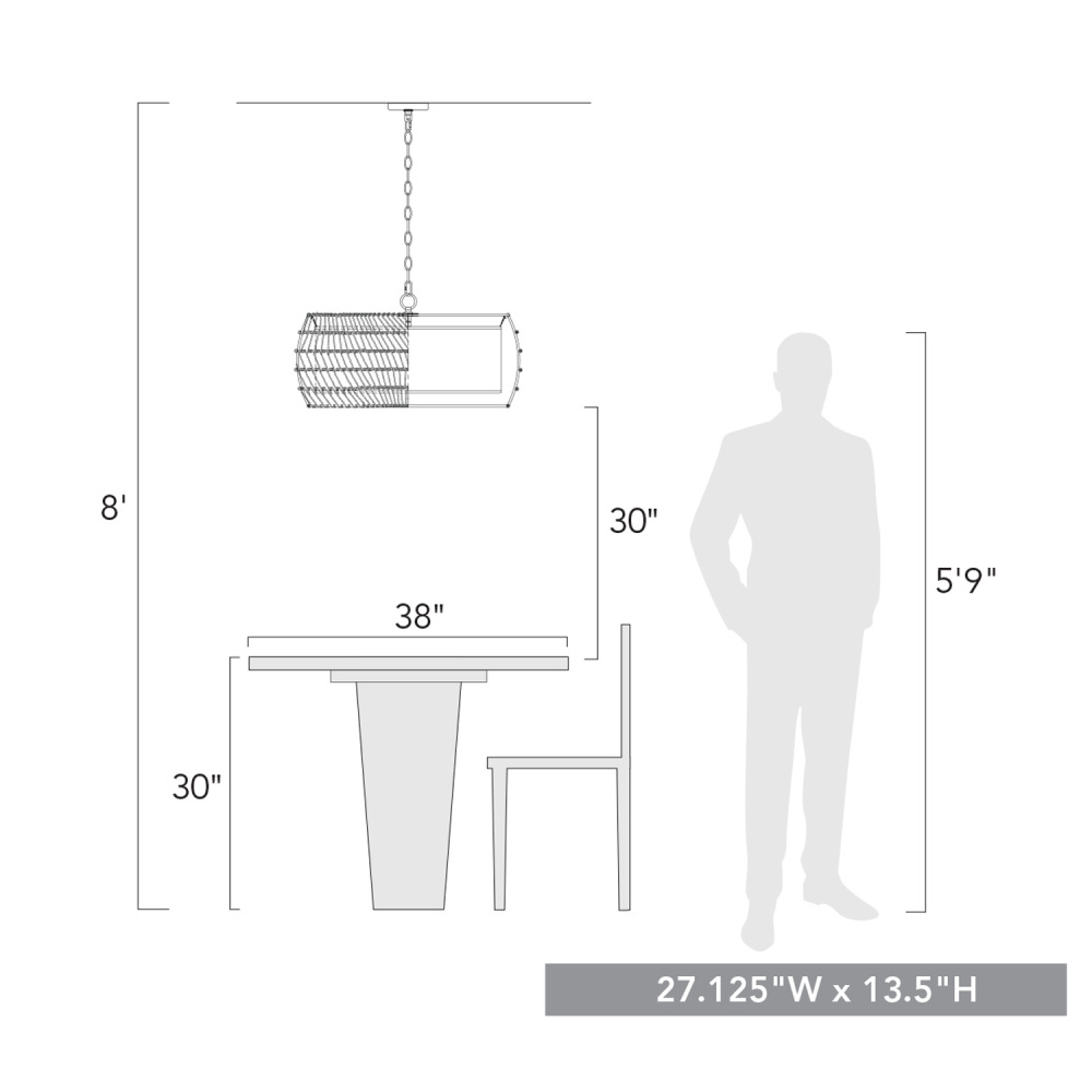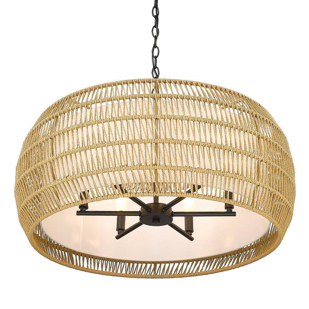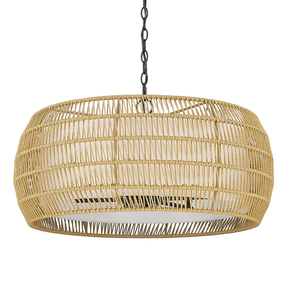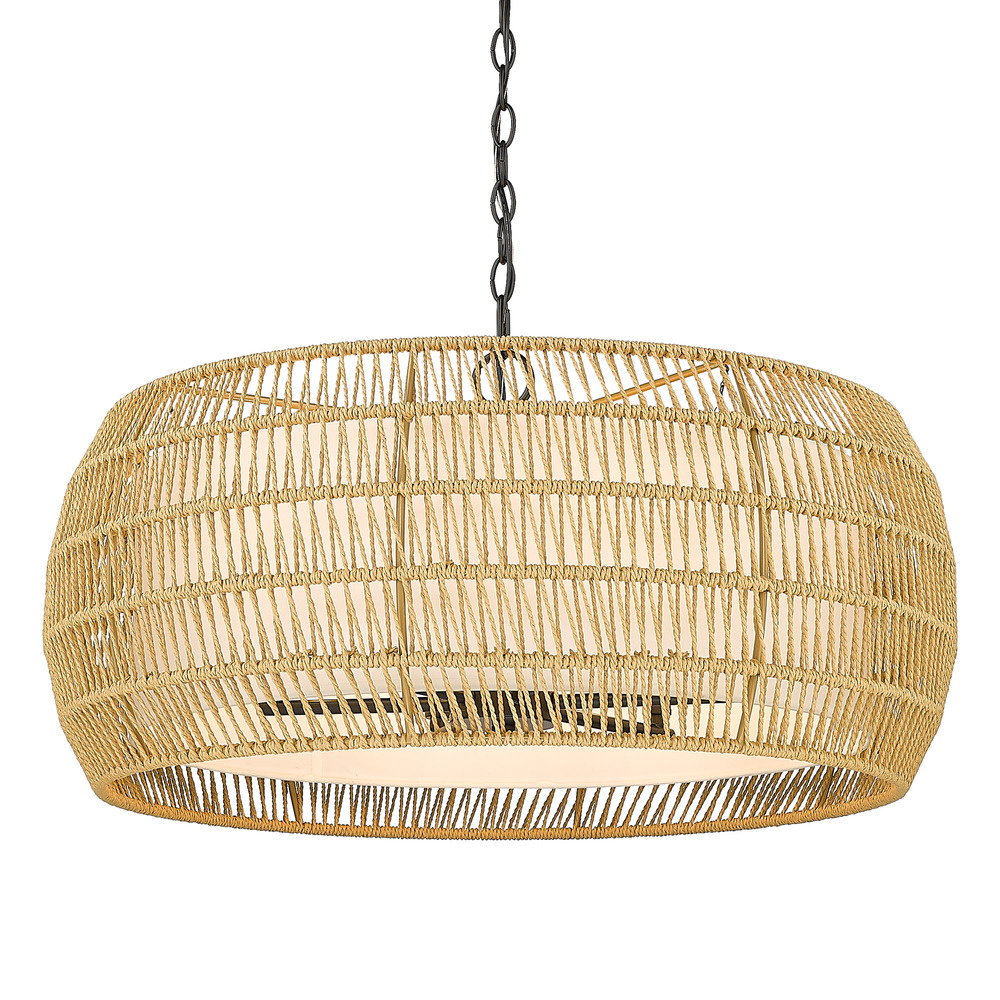 Bring coastal elegance into your home with the Golden Lighting Everly 6-light Chandelier. Featuring a natural rattan shade and a matte black frame, it creates a welcoming atmosphere. This exquisite chandelier embraces the beauty of natural materials with its natural rattan shade, wrapping a light tan twisted fiber cord that imparts an earthy, tactile quality to your décor. The artisanal texture and matte finish of the rattan resonates with bohemian charm, making a stylish statement. The matte black finish offers clean, modern lines that provide a versatile backdrop for a variety of design themes, from minimalist to contemporary. Ideal for dining rooms, foyers, and kitchen areas, the chandelier is damp location rated—perfect for spaces with occasional moisture. It is also sloped-ceiling compatible and features an adjustable height ranging from 17.5" to 90.625" for functional versatility. With overall dimensions of 27.13"W x 13.5"H x 27.13"D, this fixture requires six E12 candelabra base bulbs (not included), with a maximum wattage of 60 per bulb. Elevate your interior design with the stunning quality and charm of the Golden Lighting Everly Chandelier, ideal for creating inviting spaces.