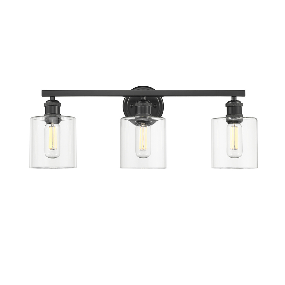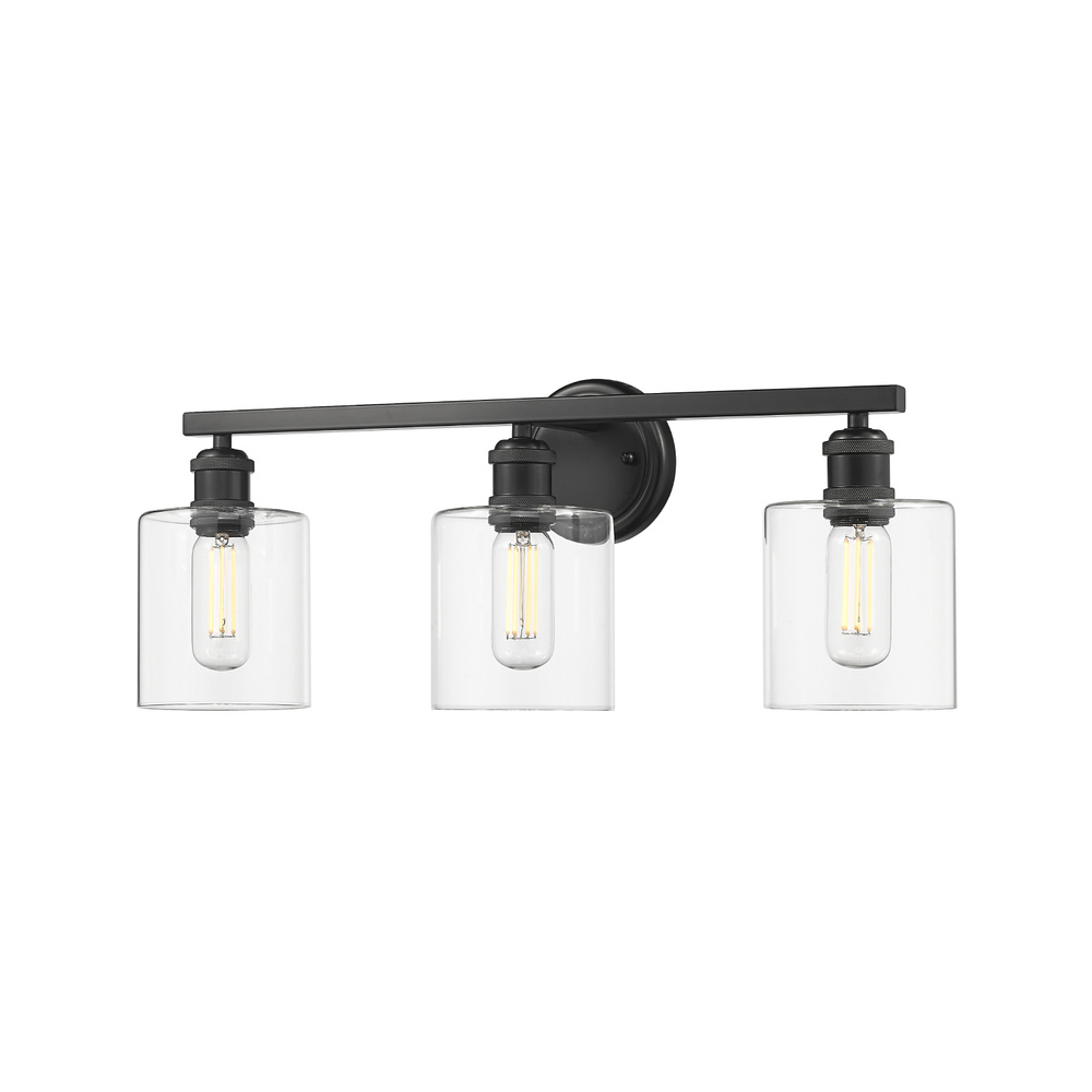 Bring modern industrial elegance into your home with the Golden Lighting Fisher 3-light Vanity in Matte Black. Featuring a clear glass shade and a matte black frame, it creates a welcoming atmosphere. The clear glass shade features brilliant, unobstructed light, allowing the beauty of the bulbs and fixture design to shine through. The matte black finish is timeless and versatile, providing a smooth, non-reflective surface that absorbs light, offering elegant sophistication to any decor. This fixture is damp location rated, making it suitable for bathrooms and other areas with occasional moisture. It requires 3 E26 Medium base bulbs (not included) with a maximum wattage of 60 per bulb. Overall dimensions: 25.13"W x 9.63"H x 7.5"D. Illuminate your space with quality and style that enhances your home’s design.
