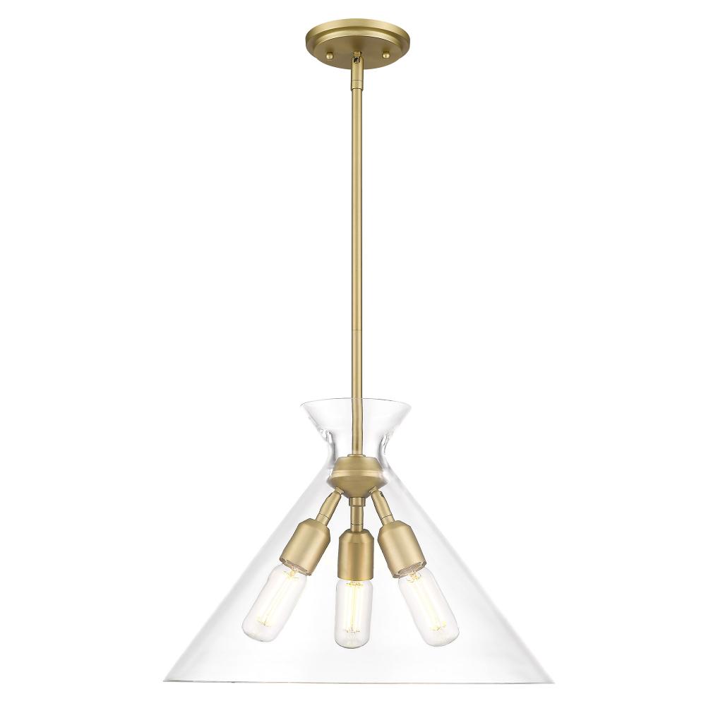 Bring transitional elegance into your home with the Golden Lighting Malta 3-light Pendant in Brushed Champagne Brass. Featuring a glass shade, it creates a welcoming atmosphere. The clear glass shade offers brilliant, unobstructed light, showcasing the beauty of the bulb while adding a sleek touch. The Brushed Champagne Brass finish provides an understated and elegant alternative to traditional gold, blending warmth and softness with a chic look. Perfect for kitchens, dining rooms, or bedrooms, this fixture is dry location rated for indoor spaces not subject to moisture. It's sloped-ceiling compatible and adjustable in height from 19" to 55". Overall, the dimensions are 18"W x 13"H x 18"D, requiring three E26 medium base bulbs (not included) with a maximum of 60 watts each. Elevate your space with the Malta 3-light Pendant and its timeless quality.