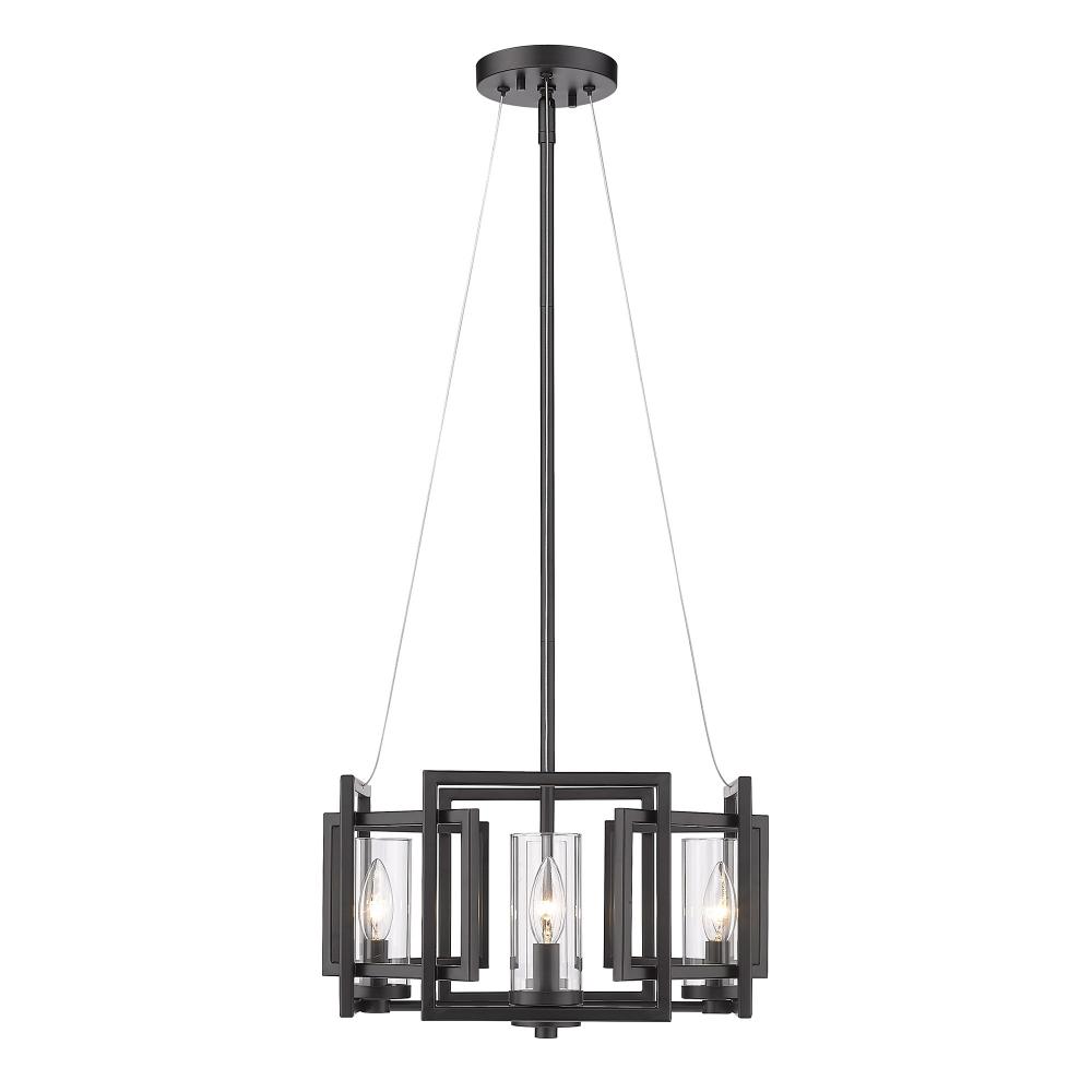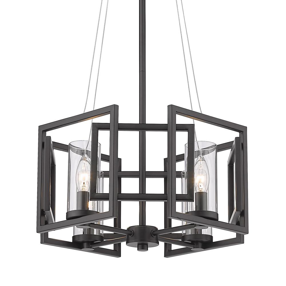 Bring modern elegance into your home with the Golden Lighting Marco 4-light Pendant in Matte Black. Featuring a glass shade and a matte black frame, it creates a welcoming atmosphere. This glass shade provides brilliant, unobstructed light, beautifully showcasing the bulb's design while complementing any style. The clear glass is polished to a high-gloss shine, making it an excellent choice for contemporary settings. The matte black finish offers a timeless and versatile aesthetic, absorbing light and creating a soft, sophisticated ambiance that suits various decor styles, from minimalist to bold contemporary. Ideal for kitchens, dining rooms, or bedrooms, this pendant is damp location rated, suitable for covered spaces with occasional moisture. Its sloped-ceiling compatibility and adjustable height from 16.375" to 46.375" ensure it fits your unique space perfectly. Overall dimensions are 16"W x 16.38"H x 16"D, and it requires 4 E12 candelabra base bulbs (not included) with a maximum wattage of 60 per bulb. With its striking design and quality craftsmanship, this pendant light adds a stylish statement to any room, embodying a blend of sophistication and modernity.