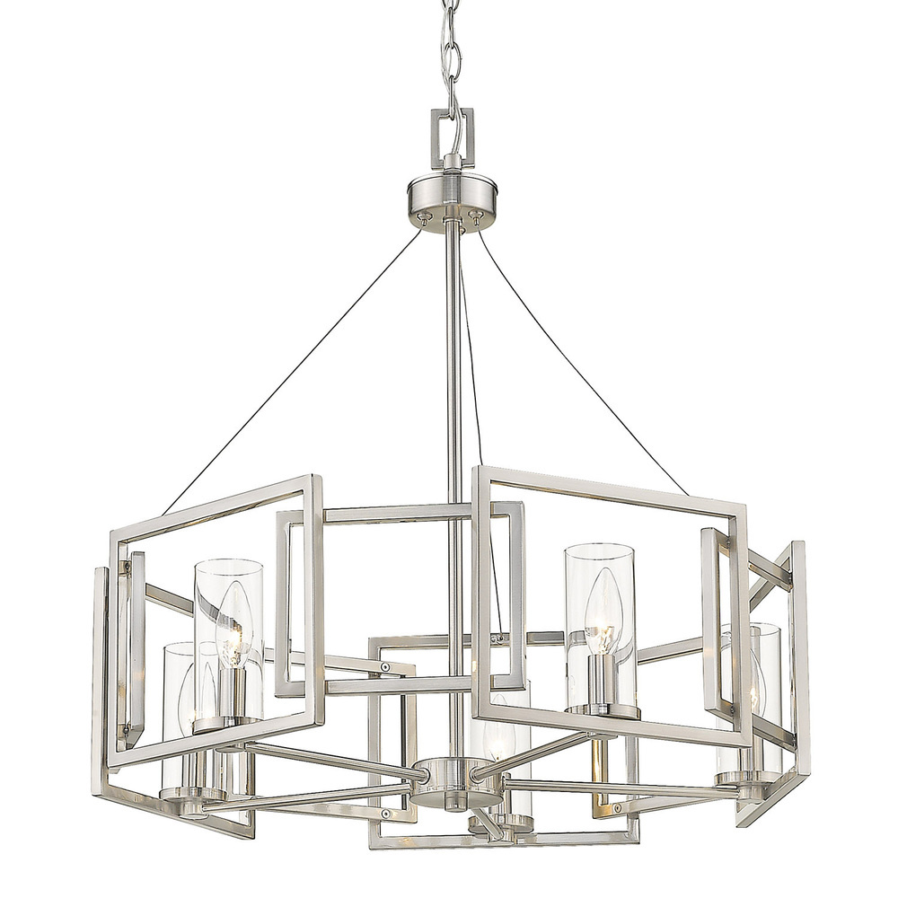 Bring modern elegance into your home with the Golden Lighting Marco 5-light Chandelier in Pewter. Featuring a glass shade and a pewter frame, it creates a welcoming atmosphere. The clear glass shade offers brilliant, unobstructed light, perfectly showcasing the fixture's exquisite design. Our pewter finish presents a medium-grey hue combined with subtle warmth, resulting in an elegant, non-glare glow that fits perfectly in both classic and contemporary settings. This chandelier is ideal for indoor spaces not subject to moisture, and it is sloped-ceiling compatible, adjustable in height from 29.625" to 98.5", making it perfect for dining rooms, living rooms, or even bedrooms. Overall Dimensions: 24.5"W x 25.38"H x 24.5"D. Requires 5 E12 candelabra base bulbs (not included), max 60 wattage per bulb. Elevate your home’s aesthetic with this stunning fixture that balances style and function beautifully.