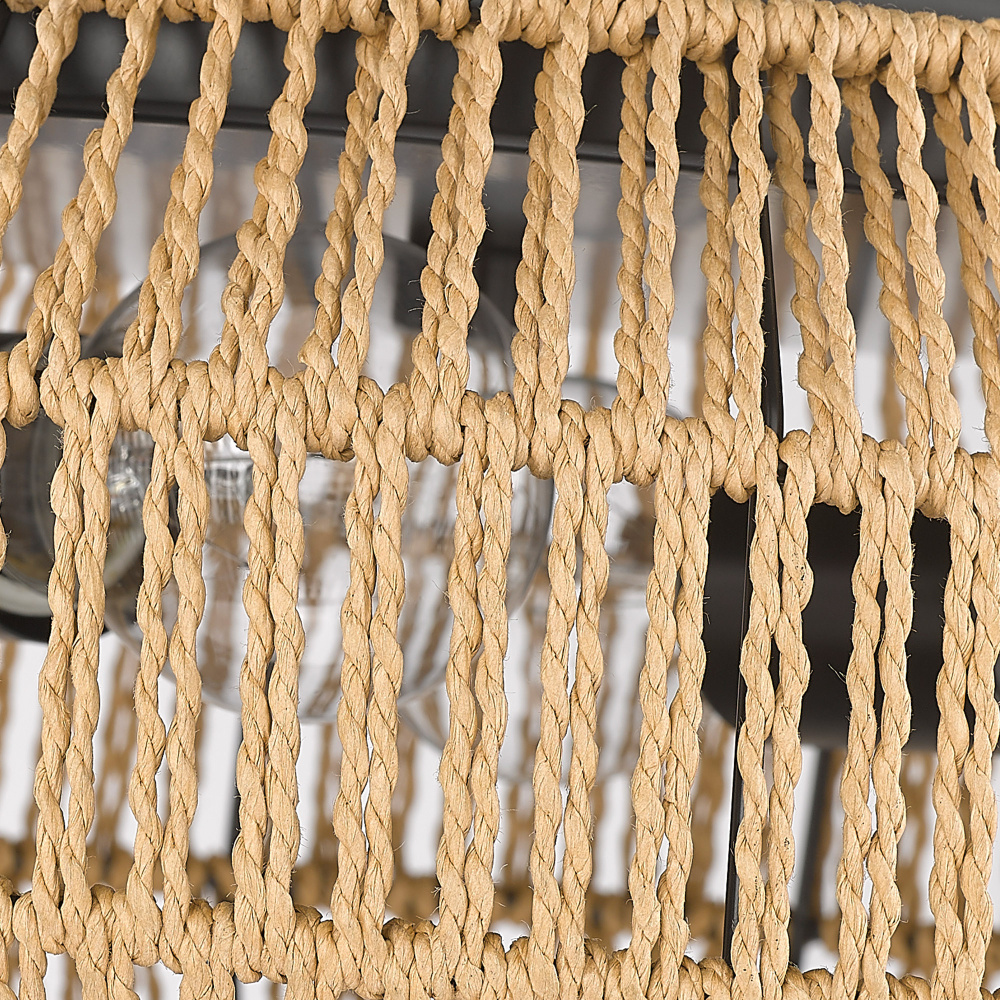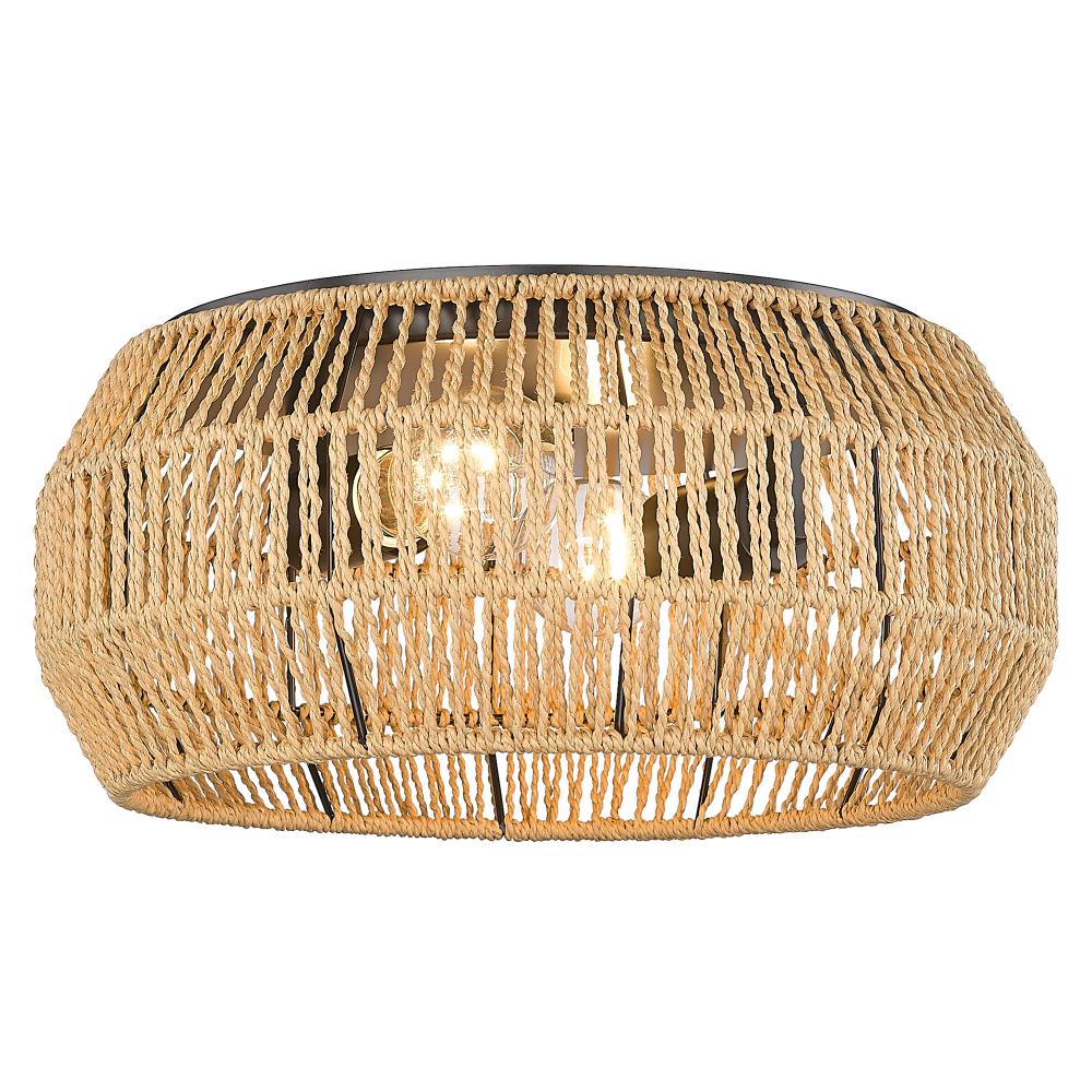 Bring nature-inspired elegance into your home with the Golden Lighting Marlee 2-light Flush Mount. Featuring a rope shade and a matte black frame, it creates a welcoming atmosphere. The natural raphia rope shade adds a breezy, coastal touch, with an open-weave design that casts gentle, inviting light. Our Matte Black finish presents a timeless, smooth surface, offering an understated elegance that fits various decor styles. This fixture is damp location rated, suitable for spaces like bathrooms and covered porches. Dimensions: 14.13"W x 6.5"H x 14.13"D, requiring 2 E26 medium base bulbs (not included, max 60 watts). Experience the captivating charm of the Golden Lighting Marlee, perfect for low ceilings and compact spaces.