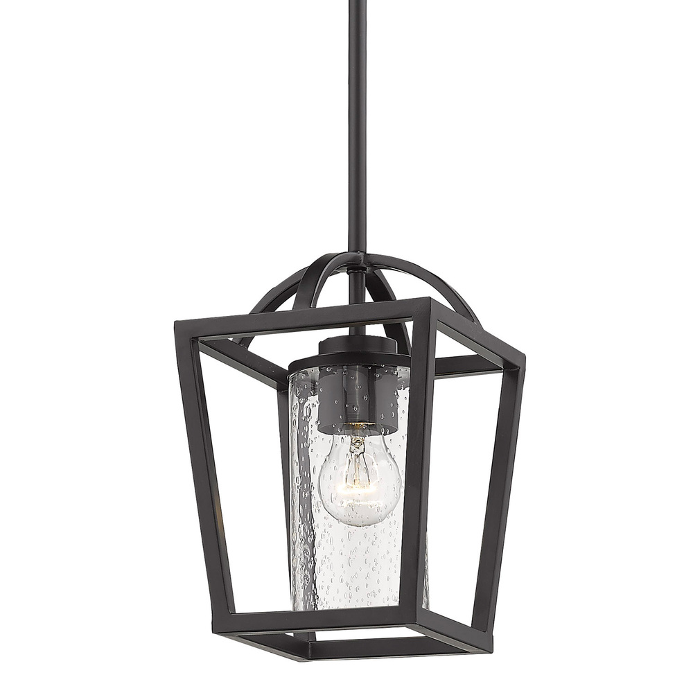 Bring modern elegance into your home with the Golden Lighting Mercer 1-light Pendant. Featuring a glass shade and a Matte Black frame, it creates a welcoming atmosphere. The seeded glass shade enhances its features, showcasing a clear, transparent glass with a glossy finish. Infused with tiny bubbles, the glass adds a vintage character and artisanal charm, gently diffusing light for a warm glow. The Matte Black finish is timeless and versatile. Its non-reflective surface absorbs light, lending an understated elegance that complements various decor styles. Ideal for kitchens, dining rooms, or bedrooms, the pendant is Damp Location Rated, making it suitable for covered spaces with occasional moisture. The convertible design allows for semi-flush mount or pendant installation, with adjustable height between 13.25" and 55.25". Dimensions: Overall 7"W x 10.25"H x 7"D. Requires 1 E26 Medium base bulb (not included), max 60 watts. Experience quality and style with the Golden Lighting Mercer Pendant, perfect for enhancing any space.