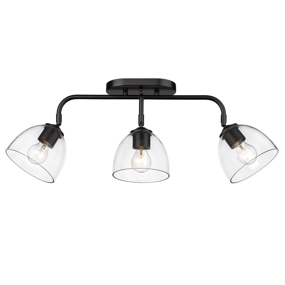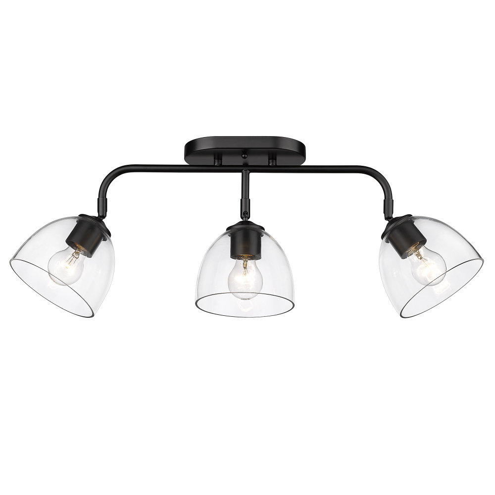 Bring timeless elegance into your home with the Golden Lighting Roxie 3-light Semi-Flush Mount in Matte Black. Featuring a glass shade and a matte black frame, it creates a welcoming atmosphere. The clear glass shade offers brilliant, unobstructed light. The perfectly transparent glass is polished to a high-gloss shine, allowing the beauty of the bulbs and design to take center stage. Its matte black finish is both timeless and versatile, providing a smooth, sophisticated look that complements any decor. This fixture is suitable for covered and semi-enclosed spaces with occasional moisture, making it perfect for entryways, kitchens, and living areas with mid-height ceilings. Adjustable directional heads allow you to customize the lighting to highlight specific areas or objects. Dimensions: 24.63"W x 10.25"H x 7.75"D. Requires 3 E26 Medium base bulbs (not included) with a maximum wattage of 100 per bulb. Elevate your space with the perfect fusion of design and functionality, embodying quality lighting solutions for modern living.