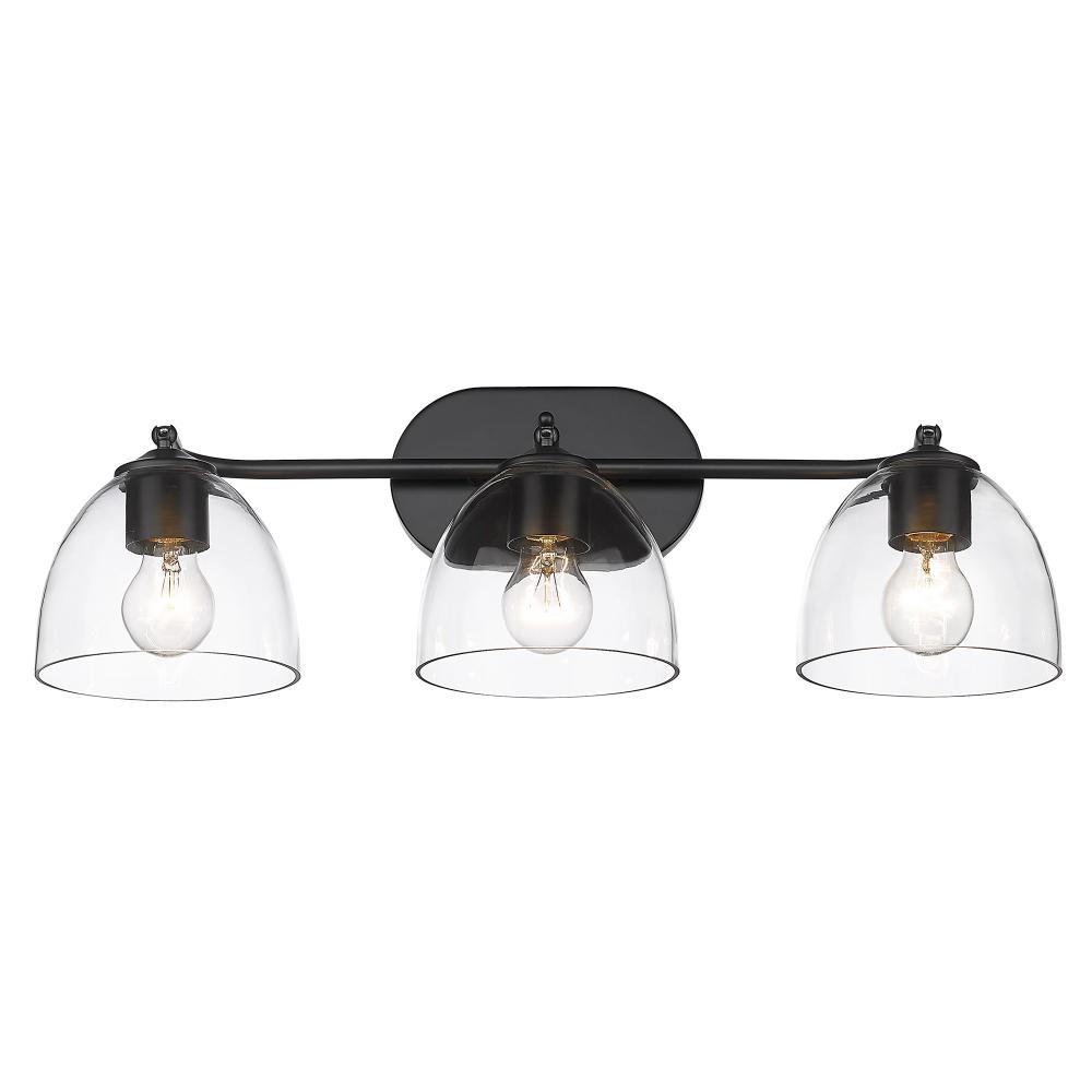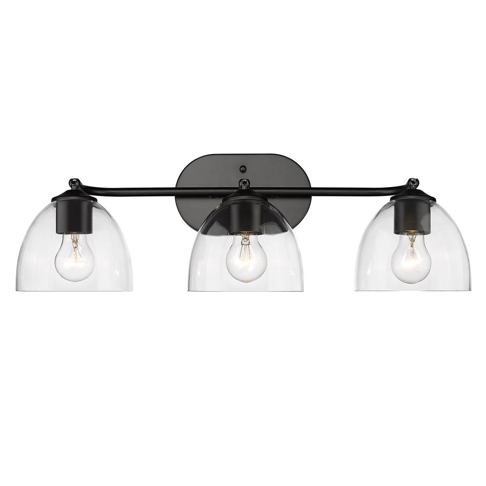 Bring modern elegance into your home with the Golden Lighting Roxie 3-light Vanity. Featuring a glass shade and a matte black frame, it creates a welcoming atmosphere. The clear glass shade offers brilliant, unobstructed light, allowing the fixture’s design to take center stage. Its smooth texture enhances the soft, sophisticated look. The matte black finish epitomizes clean, modern style, providing a timeless and endlessly versatile look that complements various decor styles. This vanity light is ideal for brightening up bathrooms, as it is damp location rated for covered spaces. Customize your lighting with adjustable directional heads to highlight specific areas. Overall dimensions are 24.63"W x 8.13"H x 7.75"D, and it requires 3 E26 medium base bulbs (not included) with a maximum wattage of 100 per bulb. Enhance your space with this quality fixture that blends style and functionality seamlessly.