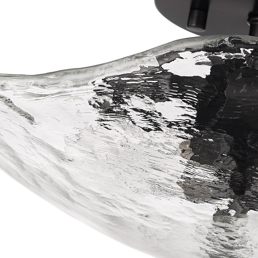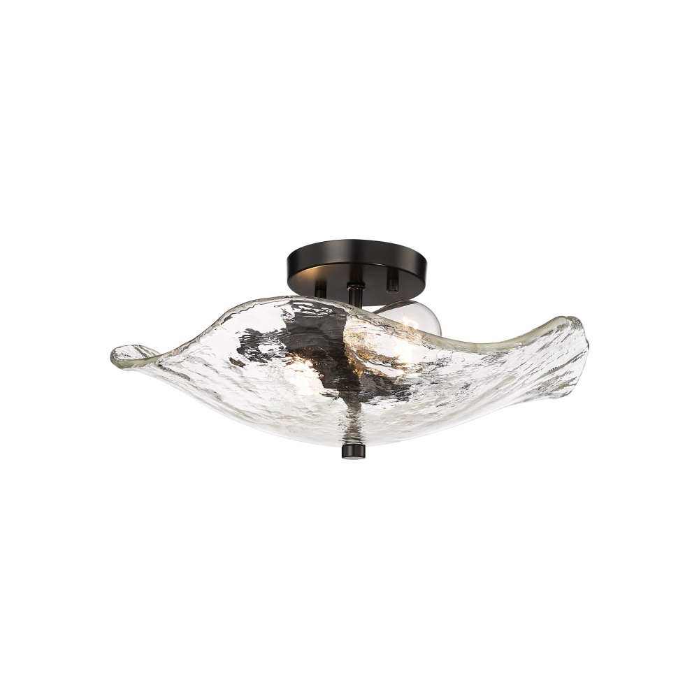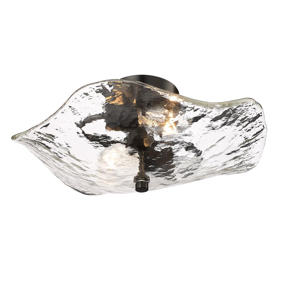 Bring nature-inspired elegance into your home with the Golden Lighting Samara 2-light Semi-Flush Mount. Featuring a glass shade and a Matte Black frame, it creates a welcoming atmosphere. The hammered water glass shade showcases a stunning texture with a glossy finish, designed to refract light beautifully, resulting in a dynamic glow that adds organic charm. Its Matte Black finish is timeless and perfectly smooth to the touch, effortlessly complementing various décors. Ideal for entryways, bedrooms, kitchens, and living areas with mid-height ceilings, this fixture is damp location rated, making it suitable for covered and semi-enclosed spaces with occasional moisture. Overall Dimensions: 15.38"W x 6.63"H x 13.25"D. Requires 2 E26 Medium base bulbs (not included), with a maximum wattage of 60 per bulb. Elevate your space with the artisanal quality and beauty of this unique fixture, designed for those who appreciate the finer details.