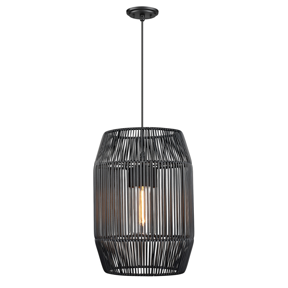 Bring nature-inspired elegance into your home with the Golden Lighting Seabrooke 1-light Outdoor Pendant. Featuring a Black Composite Wicker shade and a Natural Black frame, it creates a welcoming atmosphere. The Black composite wicker shade is handcrafted with smooth, solid black strands expertly woven to form a classic wicker look with a modern twist. Its textured finish enhances the natural charm while allowing light to filter beautifully. Our Natural Black finish offers a softer, more organic take on classic black, reminiscent of raw iron with its tactile, non-reflective matte surface. Perfect for covered outdoor spaces, the Seabrooke is Wet Location Rated, meaning it is designed to endure direct exposure to the elements. It is also Sloped-Ceiling Compatible and has an adjustable height range of 22" to 142" for versatile placement. Overall dimensions are 15"W x 21.25"H x 15"D, requiring one E26 Medium base bulb (not included) with a max wattage of 100. Elevate your outdoor setting with the charm and durability of this exquisite fixture, perfect for enhancing your relaxed, bohemian-inspired decor.