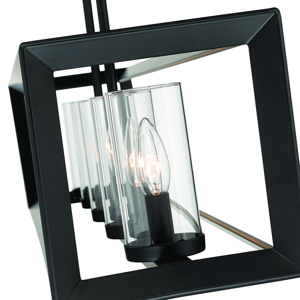 Bring contemporary elegance into your home with the Golden Lighting Smyth 5-light Island Light. Featuring five clear glass shades supported by a Matte Black frame, this light fixture creates a stunning visual centerpiece. The Clear Glass shades provide brilliant illumination, showcasing the beauty of the bulbs within. Each shade is polished to a high-gloss shine, allowing unobstructed light flow while maintaining a timeless appeal. The Matte Black finish is sleek and sophisticated, blending seamlessly into a range of decor styles, from contemporary to industrial. Tailored for kitchen islands, this fixture is ideal for spaces not subject to moisture, making it rated for dry locations. The convertible design with adjustable height allows for versatile installation as a semi-flush mount or pendant. With adjustable heights ranging from 13.75" to 31.25", this fixture adapts beautifully to any ceiling configuration. Overall dimensions are 41"W x 8.88"H x 8.25"D, and it requires 5 E12 Candelabra base bulbs (not included, max 60 wattage per bulb). Enhance your dining area with this stylish light fixture that combines practicality with aesthetic appeal.