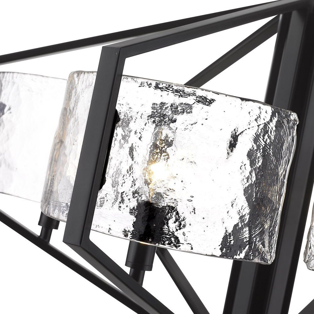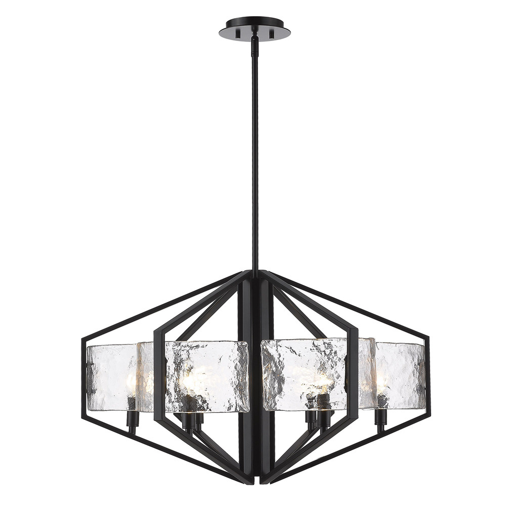 Bring modern elegance into your home with the Golden Lighting Varsha 6-light Chandelier. Featuring a glass shade and a matte black frame, it creates a sophisticated atmosphere. The chandelier's glass shade showcases a hammered water glass design, capturing and refracting light to create dynamic and intricate patterns, making it a stunning focal point in any room. Its matte black finish is both timeless and endlessly versatile, adding understated elegance that complements various decor styles from industrial to contemporary. Ideal for grand dining rooms and luxurious foyers, this chandelier is dry location rated for indoor use, ensuring it shines brightly in spaces free from moisture. Installation is simple with sloped ceiling compatibility and adjustable height options ranging from 24.125" to 60.125". Overall Dimensions: 27.5"W x 16.88"H x 27.5"D. Requires 6 E12 candelabra base bulbs (not included), with a maximum wattage of 60 per bulb. The Varsha Chandelier is not just a light, it’s a beautiful statement piece that reflects quality and style.