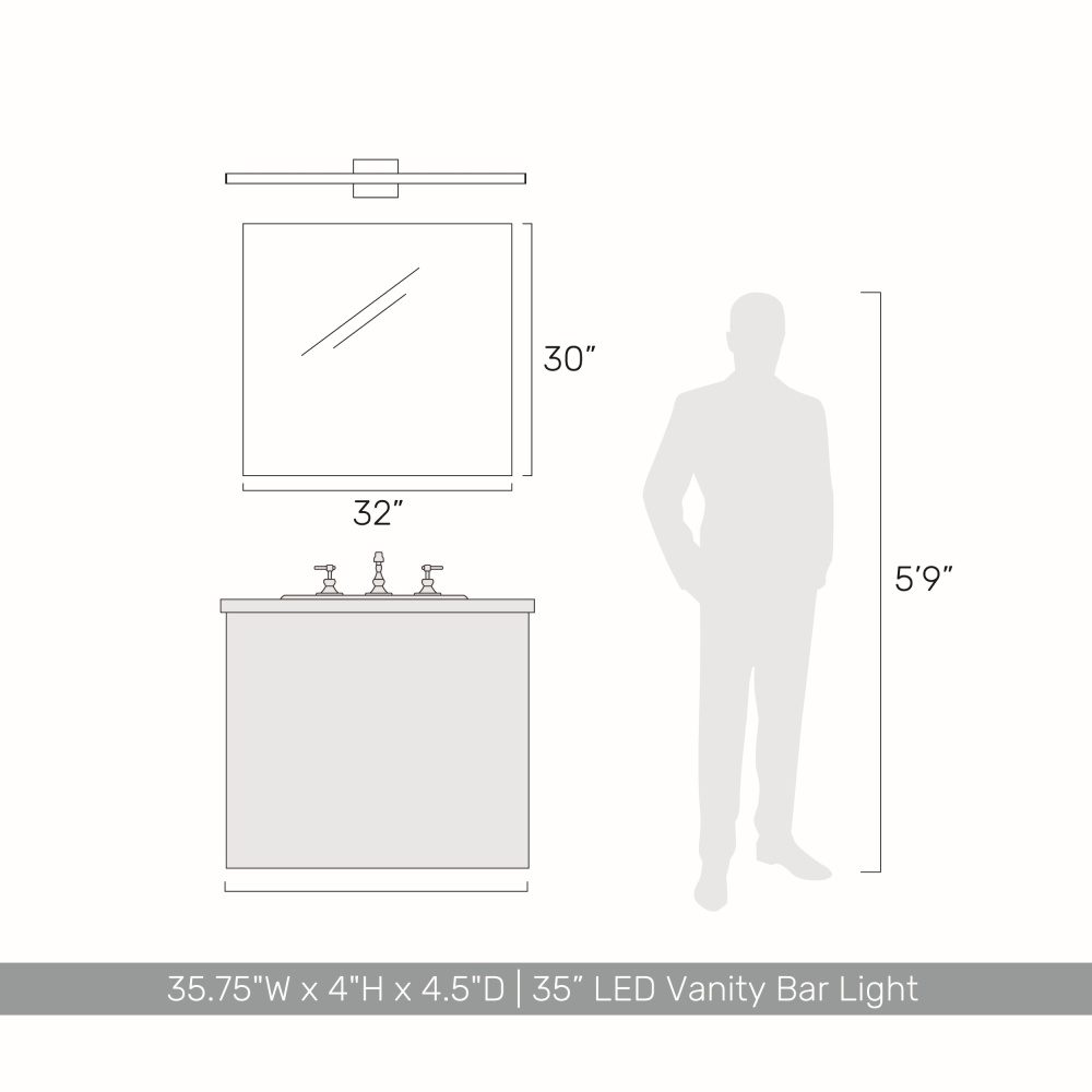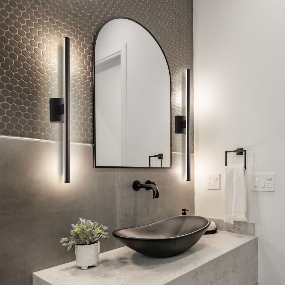 Bring modern elegance into your home with the Golden Lighting Vireo Integrated LED 36in Vanity in Sand Black. This sleek and minimalist fixture creates a welcoming atmosphere while providing brilliant task lighting. Featuring a sophisticated Sand Black finish, it offers a textured appeal with its non-reflective matte surface. This durable finish beautifully absorbs light, making it both practical and stylish. Suitable for bathrooms, the Vireo's damp location rating ensures it's perfect for spaces with occasional moisture while its versatile mounting options allow for either vertical or horizontal installation. Overall dimensions of 35.75"W x 4"H x 4.5"D, paired with integrated LED technology, provides 1260 rated lumens at a warm 3000K glow. Experience twice the light with bi-directional glow, offering both up and down lighting for a balanced, ambient glow. Energize your space with the perfect blend of quality and style from Golden Lighting.