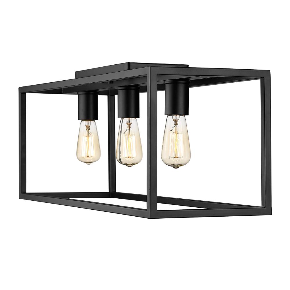Bring understated elegance into your home with the Golden Lighting Wesson 3-light Flush Mount in Matte Black. Featuring no shade and a deep matte black frame, it creates a refined atmosphere that complements various decors. The robust, open metal cage design showcases exposed bulbs, celebrating the allure of modern industrial style. Our matte black finish features a true non-reflective surface that adds a soft, sophisticated look with a strong graphic quality to your space. Ideal for low ceilings in hallways, closets, laundry areas, and bathrooms, this flush mount is damp location rated and suitable for spaces prone to occasional moisture like covered porches. It requires 3 E26 Medium base bulbs (not included), with a maximum wattage of 100 per bulb. Overall Dimensions: 25.25"W x 9.63"H x 8.25"D. This generous flush mount design creates a substantial focal point while ensuring excellent light distribution and quality craftsmanship.