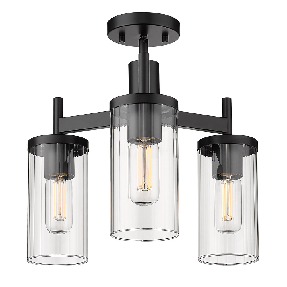 Bring modern elegance into your home with the Golden Lighting Winslett 3-light Semi-Flush Mount. Designed with a clear glass shade and a matte black frame, it radiates style while enhancing your living space. This exquisite glass shade features a ribbed texture that beautifully refracts light, creating an inviting glow that enriches your decor. The clear ribbed glass is a perfect blend of modern and classic, adding depth and sophistication to any room. Featuring a matte black finish that absorbs light while maintaining a sleek surface, this semi-flush mount is damp location rated and suitable for areas with occasional moisture. Ideal for entryways, kitchens, and bedrooms, it is designed for safe and secure installation on sloped ceilings. Dimensions: Overall dimensions are 16.5"W x 15"H x 16.5"D. Requires three E26 medium base bulbs (not included), with a maximum wattage of 60 per bulb. Complete your home's aesthetic with the Golden Lighting Winslett Collection, where style meets functionality.