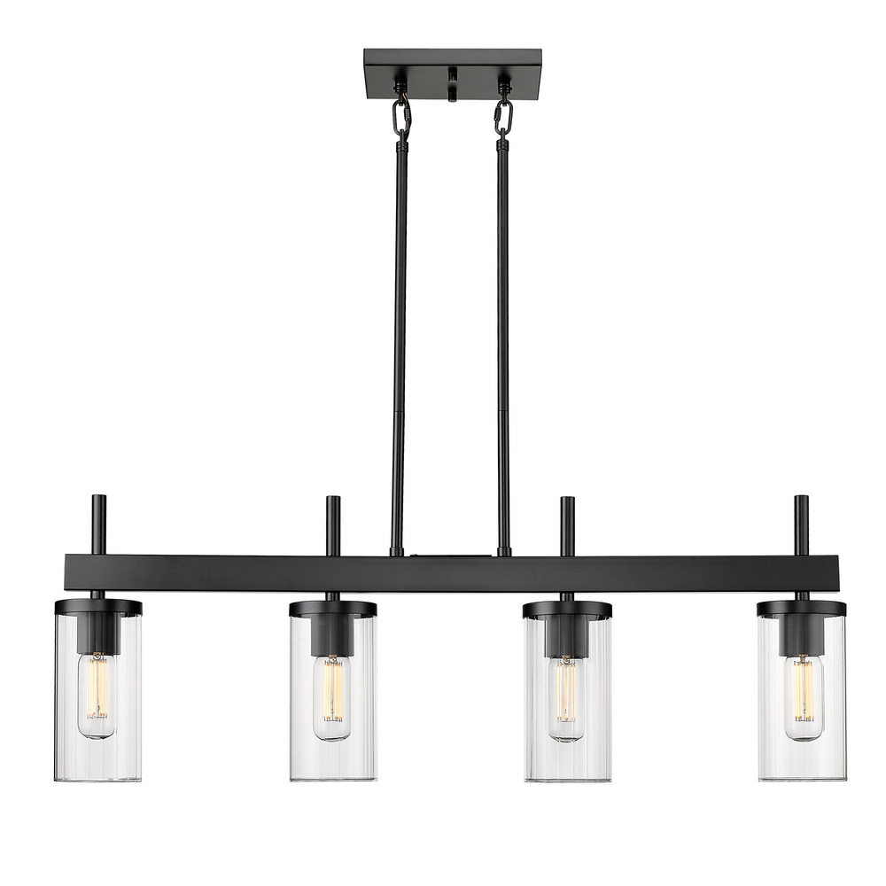 Discover modern sophistication with the Golden Lighting Winslett 4-light Island Light in Matte Black. Its clear glass shades and matte black frame offer a perfect blend of utility and style for any kitchen island. The clear glass shade showcases a unique ribbed texture that refracts light beautifully, creating a warm, inviting glow. Our matte black finishing creates an understated elegance, making it an ideal choice that complements a range of decor styles from industrial to contemporary. Designed for kitchen islands, this dry location rated fixture is ideal for use in areas not subject to moisture, while also being adjustable and compatible with sloped ceilings. Overall Dimensions: 34.63"W x 12.5"H x 4"D. Requires 4 E26 medium base bulbs (not included), max 60 wattage per bulb. Enhance your home with a fixture that brings both illumination and a polished aesthetic.
