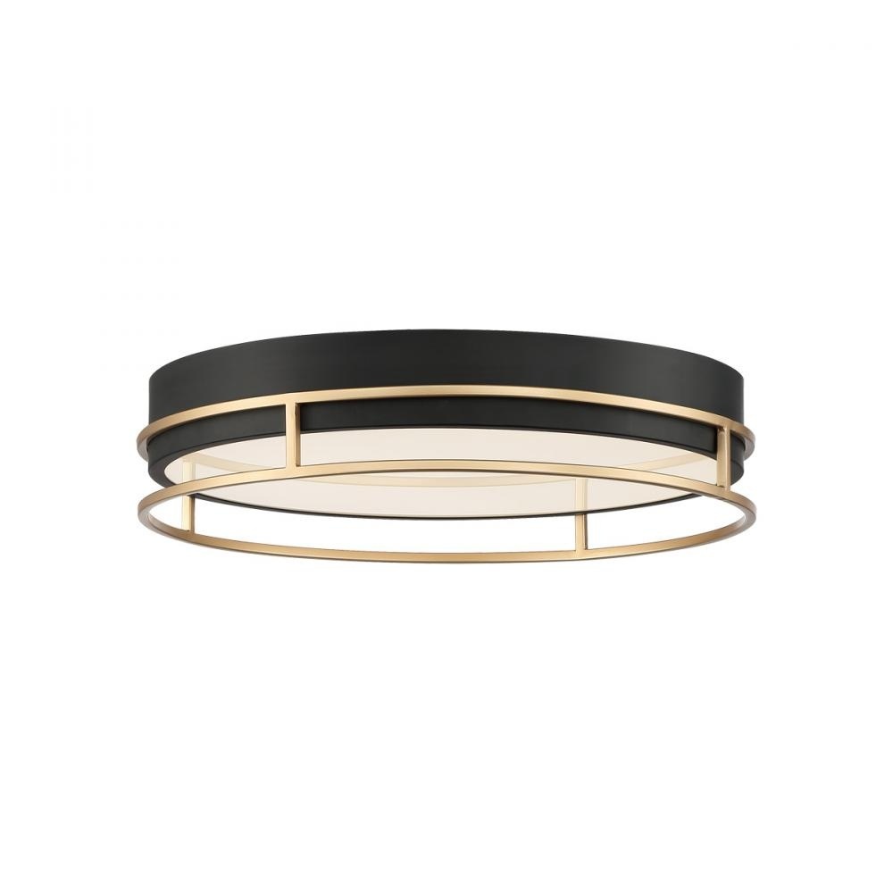 Basic form and rich finishes give prominence to clean elegance. A frosted glass sits securely within a matte black drum that houses LED light. This effortless design draws attention to the simple decorative rings that frame the black cylinder in bright contrast