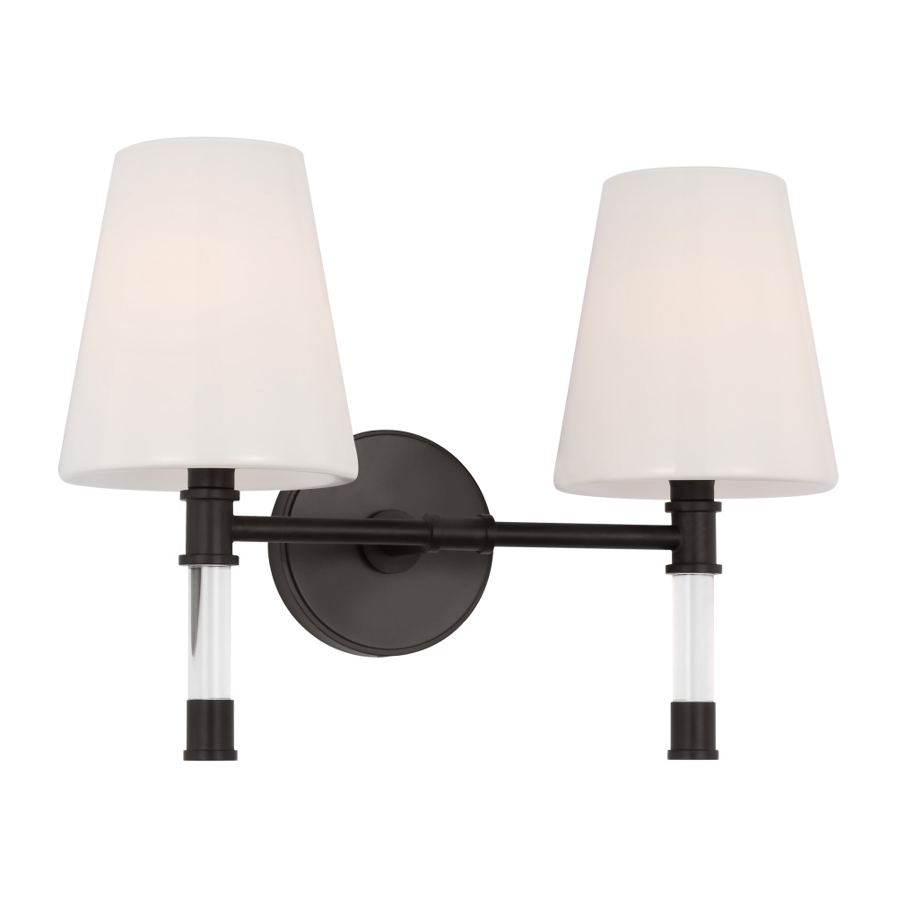 In the Hanover two-light wall vanity, Lucite arms form an elegant, dynamic silhouette that stems from a hub of either Burnished Brass and Polished Nickel finish and extends to matching color candle tubes, topped with exposed candelabra bulbs. Round backplate.