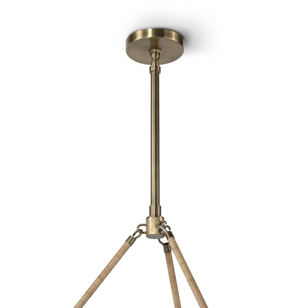 Chandelier features hand-stitched cognac leather wrapped over metal shades, complemented with coiled natural rattan details and antique brass rods and canopy hanging kit. Adjustable assembly includes 1 x 18", 2 x 12" rods, 1 x 6" rod and 1 x 3" rod for cu