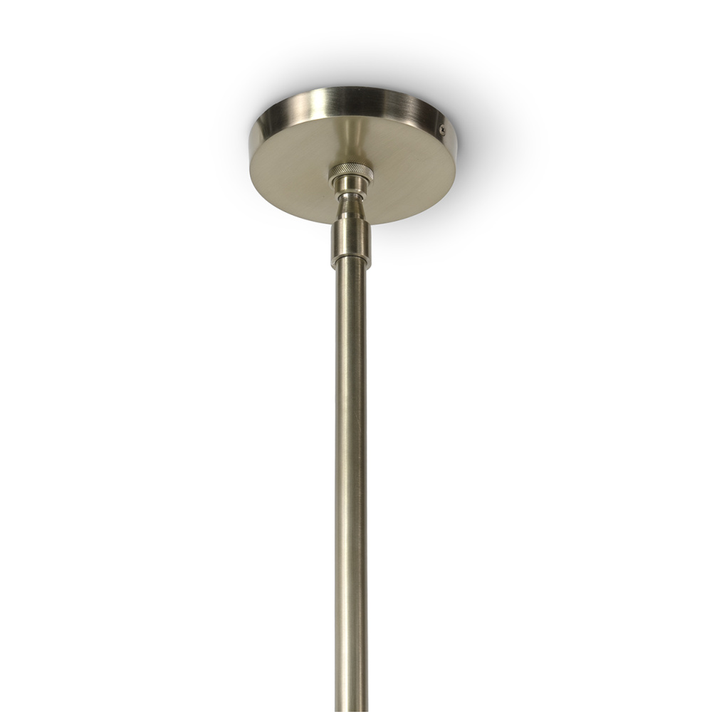 Hand-stitched cream leather wrapped over a metal shade complemented with coiled bleached rattan details and champagne finished brass rods and hanging canopy hanging kit. Adjustable assembly includes 2 x 12" rods, 1 x 6" rod and 1 x 3" rod for customizable