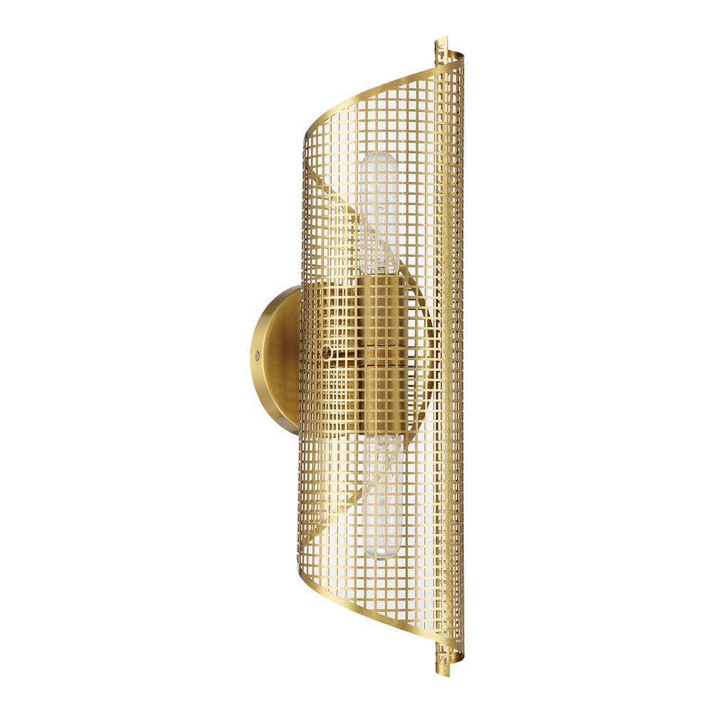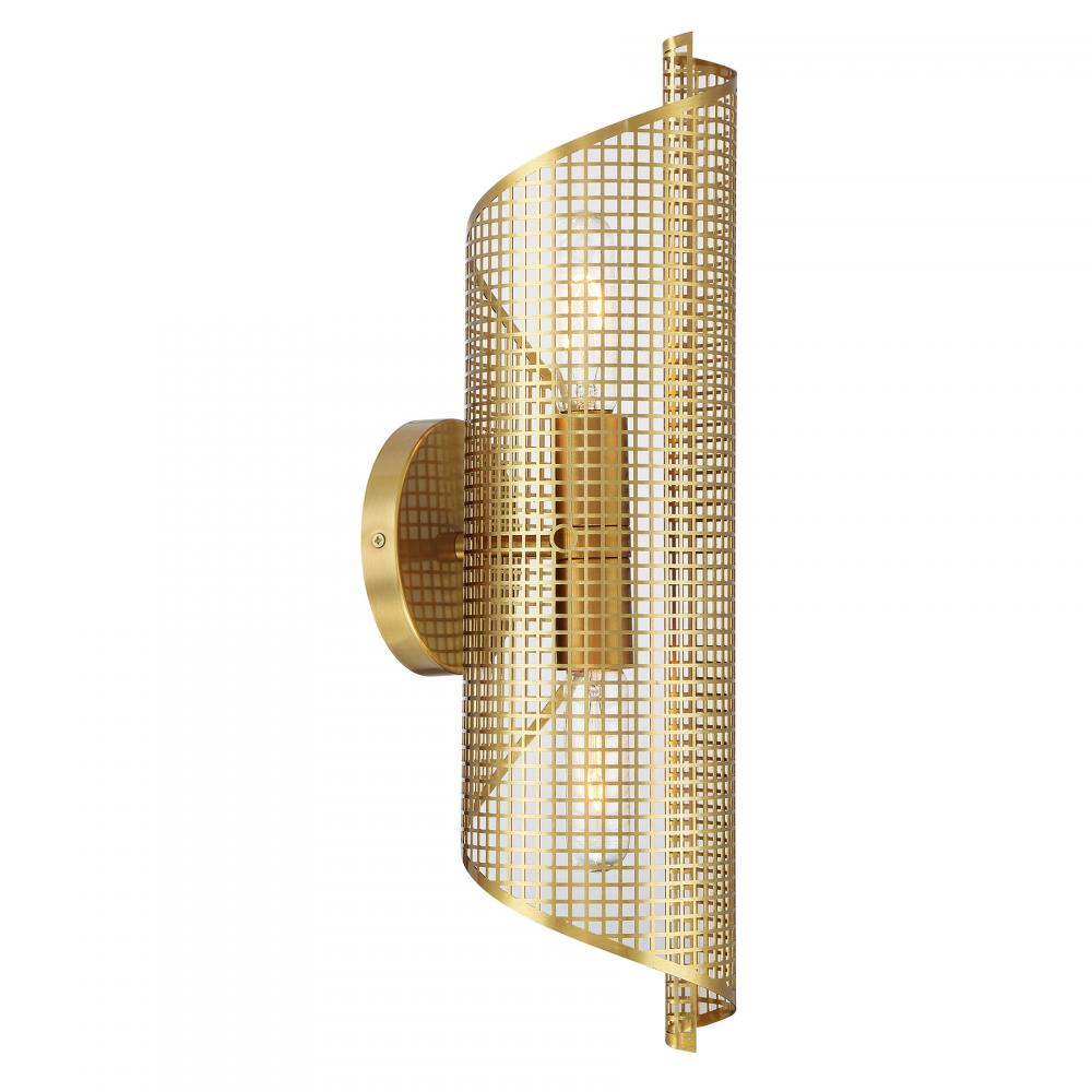 The Savoy House Hillbourne 2-light sconce is a ribbon of intriguing urban loft style. Its perforated metal shade, finished in Warm Brass, appears to swirl and twirl on the wall. Use it alone or in groupings! Hillbourne is 20" in height, 5.5" in width and extends 6.5" from the wall. Uses two standard size bulbs of up to 60 watts per bulb. Bulbs not included. This sconce is damp area rated.
