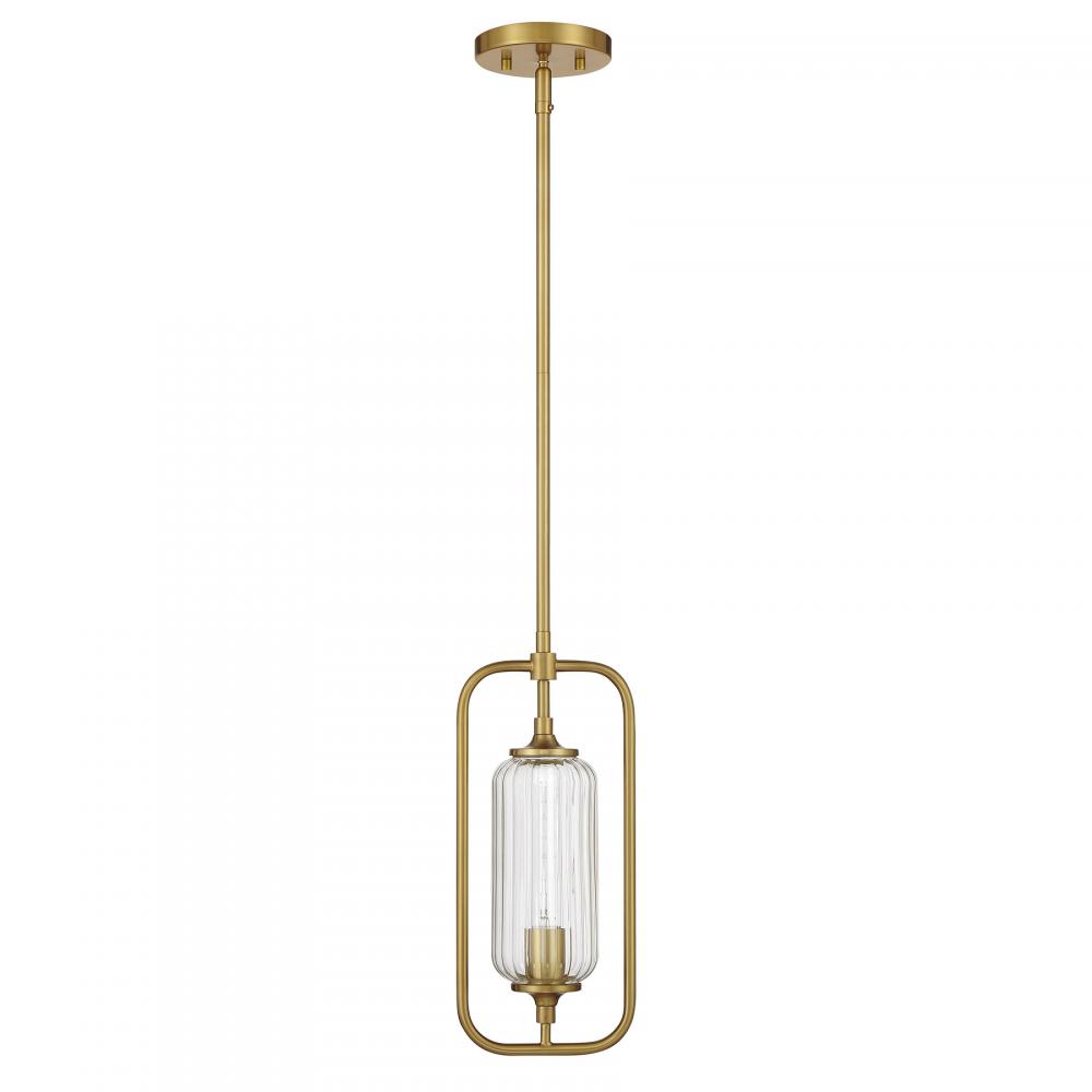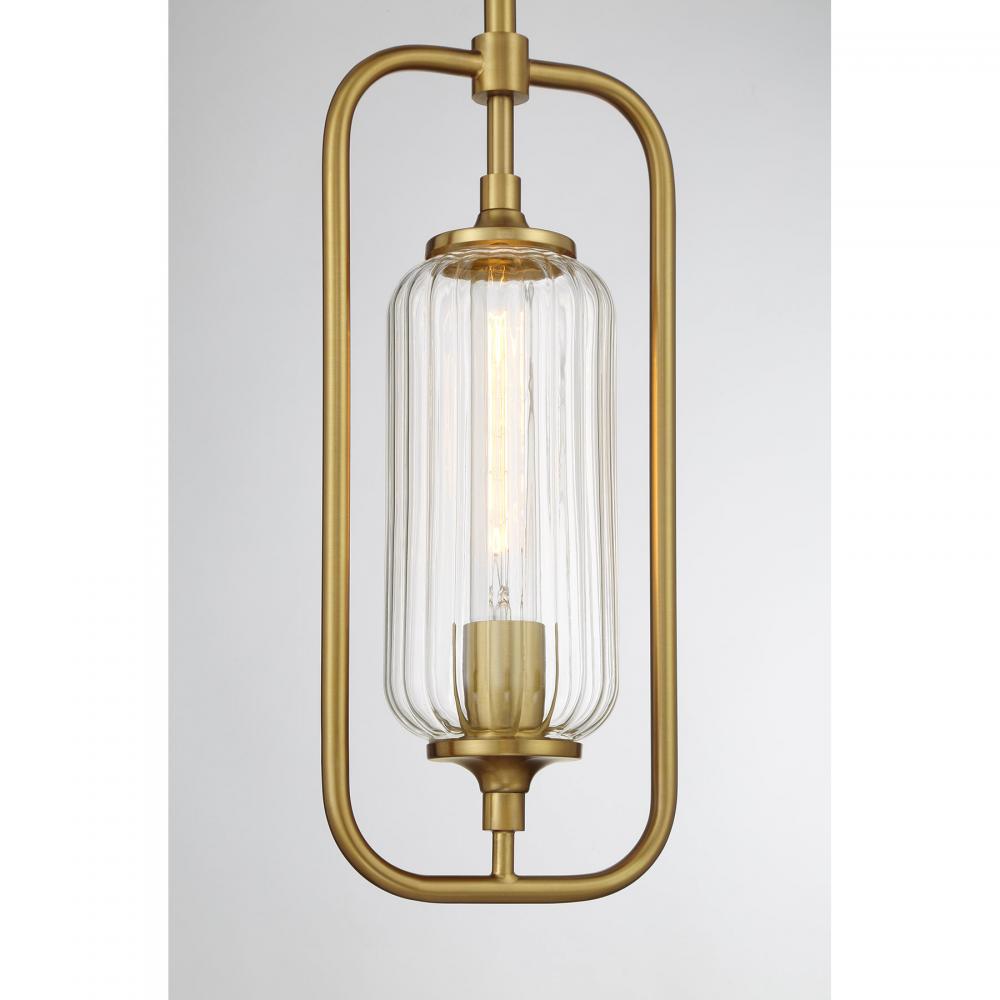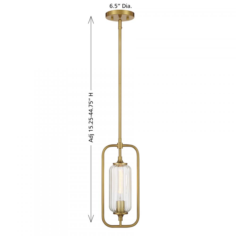 The Savoy House Holton 1-light mini pendant showcases an inventive and geometric style with a tall, rounded shade of clear ribbed glass and a slim, rounded structure finished in Warm Brass. It will bring a big dose of style to any space! Holton is 6.5" in width and has an adjustable height ranging from 15.25" to 44.75". It uses one standard size bulb of up to 60 watts. Bulb not included. Comes with three 9.5" downrods.