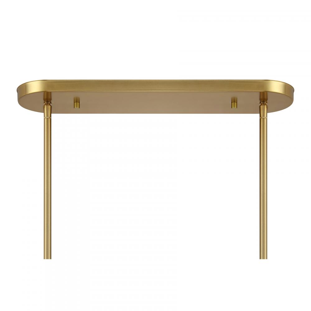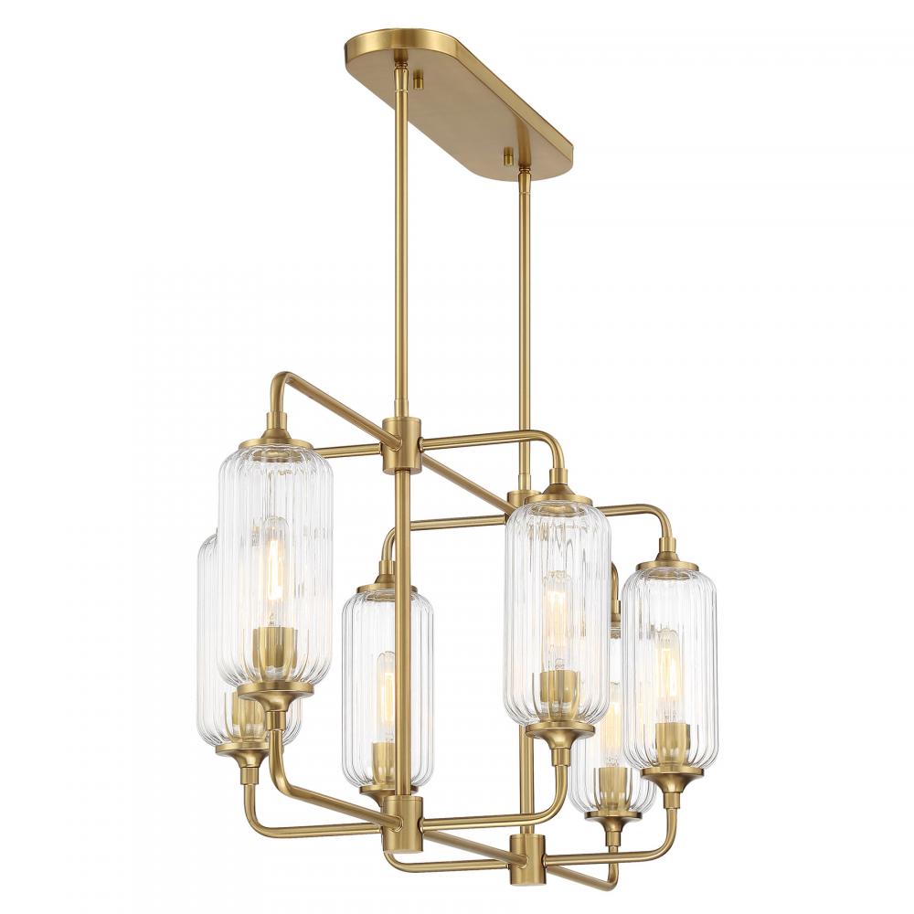 The Savoy House Holton 6-light linear chandelier showcases an inventive and geometric style with tall, rounded shades of clear ribbed glass and a slim, rounded structure finished in Warm Brass. It will bring a big dose of style to any space! Holton is 42" in length, 16" in width and has an adjustable height ranging from 17" to 71". It uses six standard size bulbs of up to 60 watts per bulb. Bulbs not included. Comes with eight 12" downrods and two 6" downrods.