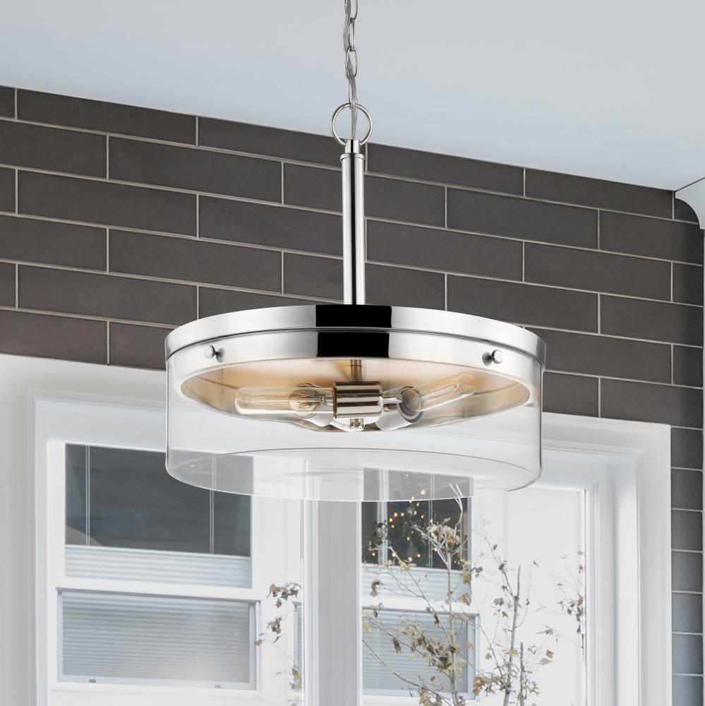 The blend of styles (modern, industrial and chic) is incorporated beautifully into the design of the Intersection 60-7630 pendant. The clear glass shade showcases vintage filament bulbs for a touch of nostalgia. The sleek, mirror-like, polished nickel will