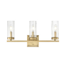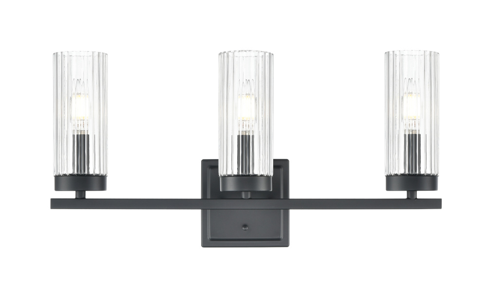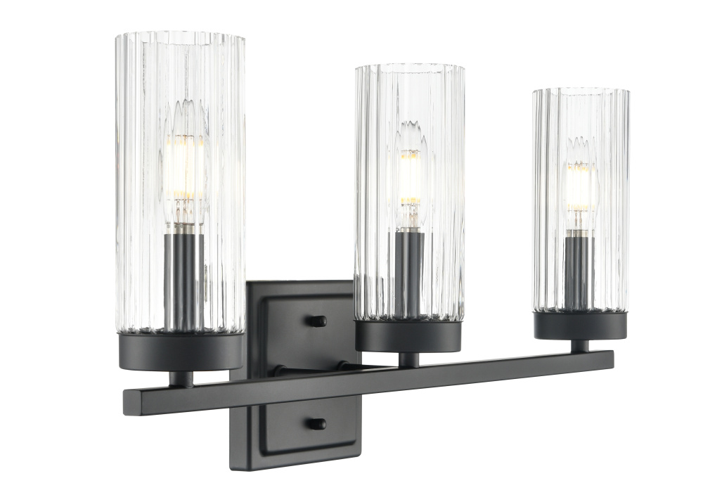 The Iversen Family of vanity and sconce lighting is distinguished by a blend of sleek lines accentuated with post-industrial style hardware. From the square backplate with inset design, to the sparkling clear reeded glass shades, the result is a dazzling play of light perfect for bath or hallway. These exceptional fixtures are available as 1-light sconces and 2-, 3-, or 4-light vanity lamps and are finished in brushed nickel, chrome, matte black, or vintage brass.