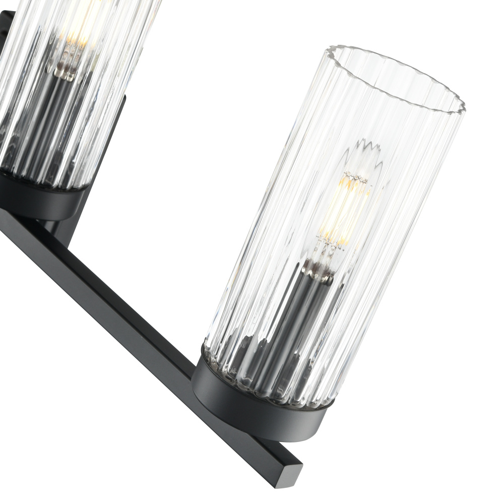 The Iversen Family of vanity and sconce lighting is distinguished by a blend of sleek lines accentuated with post-industrial style hardware. From the square backplate with inset design, to the sparkling clear reeded glass shades, the result is a dazzling play of light perfect for bath or hallway. These exceptional fixtures are available as 1-light sconces and 2-, 3-, or 4-light vanity lamps and are finished in brushed nickel, chrome, matte black, or vintage brass.
