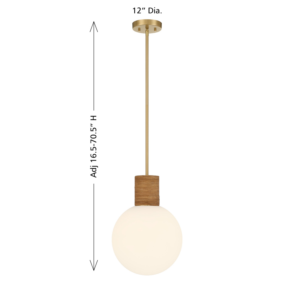 The Savoy House Jarrell 1-light pendant blends natural rattan, soft white opal glass and a glowing Warm Brass finish, bringing easygoing style to kitchens, hallways and more. Jarrell is 12" wide and height-adjustable from 16.5" to 70.5". It uses one standard size bulb of up to 60 watts (bulb not included) and includes four 12" downrods and one 6" downrod.