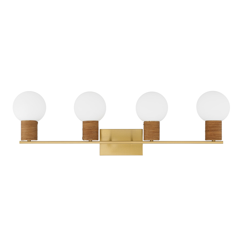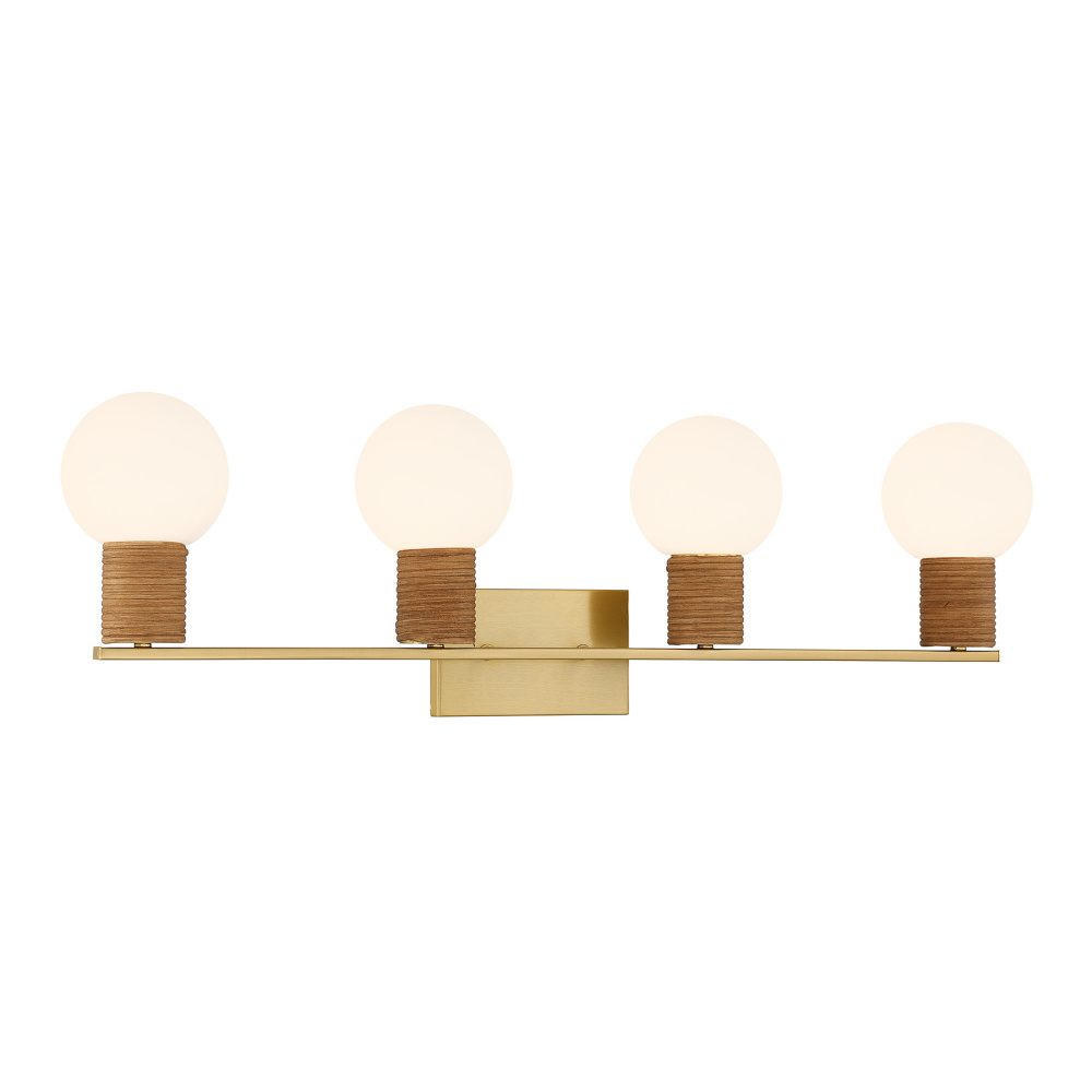 The Savoy House Jarrell 4-light vanity light layers natural rattan and glowing white opal glass with a radiant Warm Brass finish for a soft, uplifting effect. Jarrell is 10" tall, 33.5" wide and extends 6.5" from the wall. It uses four candelabra size bulbs of up to 60 watts each (bulbs not included).