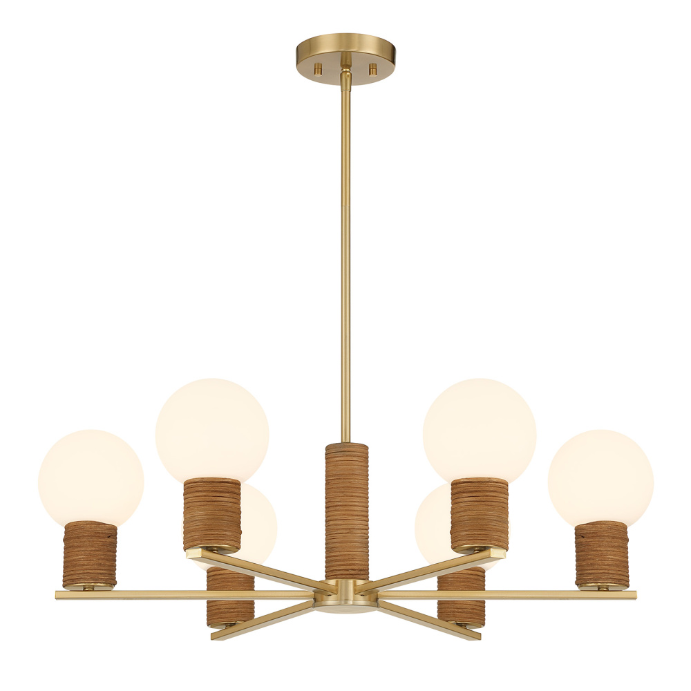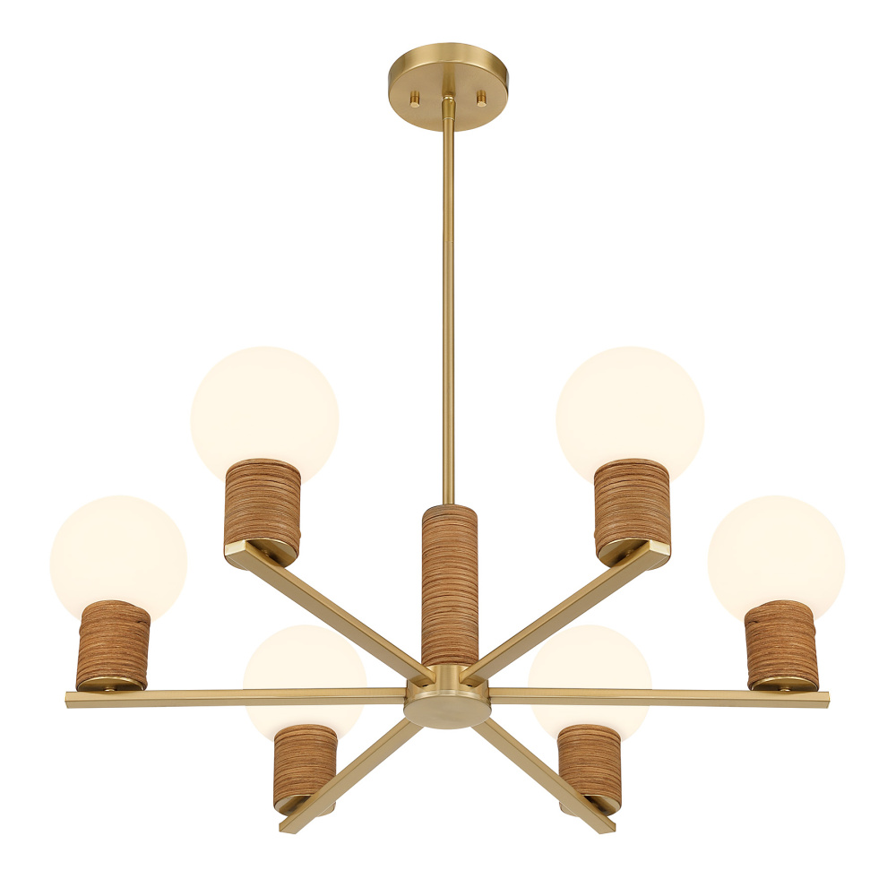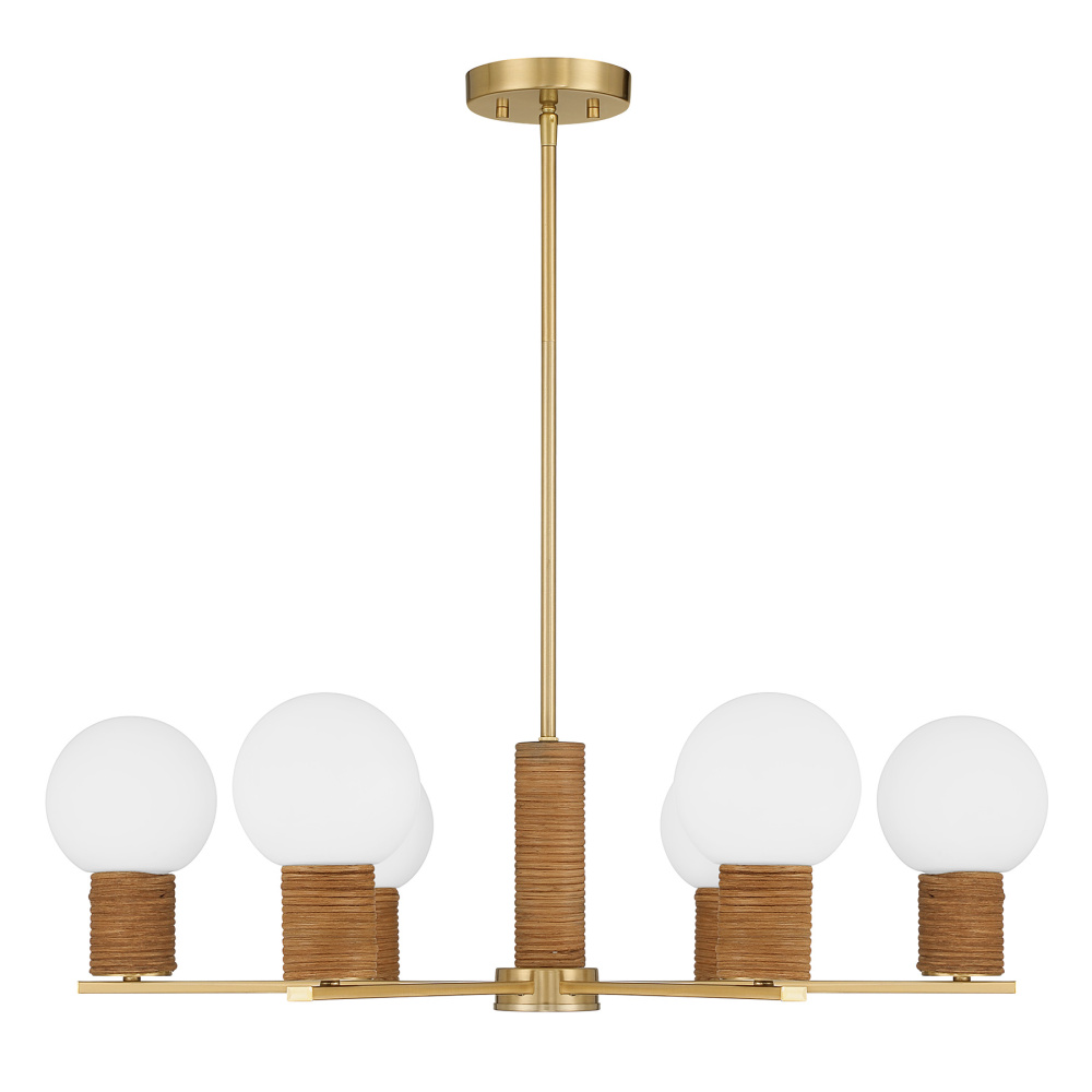 The Savoy House Jarrell 6-light chandelier blends breezy natural materials with a warm, welcoming glow. Natural rattan accents and white opal glass pair effortlessly with the Warm Brass finish, creating a look that feels fresh and inviting. Jarrell is 30" wide and height-adjustable from 9.5" to 63". It uses six candelabra size bulbs of up to 60 watts each (bulbs not included) and includes four 12" downrods and one 6" downrod.