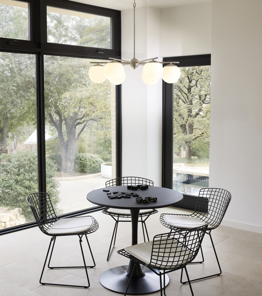 Part of the Main Street collection, the Jasper collection showcases a modern hub-and-spoke design with round globe shades and clean symmetry. Available in matte black or satin nickel and offered in both 3-light and 6-light configurations, it’s designed to suit a range of modern interiors.