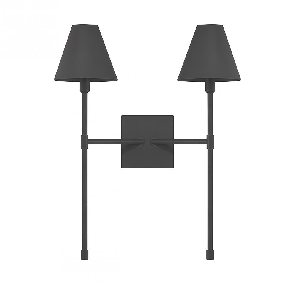 This Savoy House Jefferson 2-light sconce features a long sleek body, metal shades for indirect illumination and a classy, contemporary silhouette. Matte black finish. Jefferson is 20" in height, 16" in width and extends 7" from the wall. It uses two candelabra size bulbs of up to 60 watts per bulb (bulbs not included).