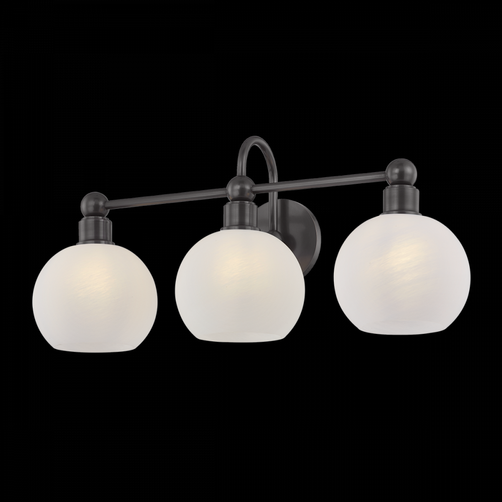 There’s a sense of visual ease in the continuity of circular forms in the Jerica bath light. The silhouette is understandable and usable, yet elevated by decorative sphere details, curved lines, and matte cloud glass globes. Choose from a gleaming Aged Brass finish, or opt for Old Bronze for a more modern take. Whether as a sconce or bath bar, Jerica illuminates your daily routines with serene style.