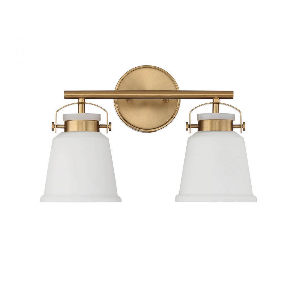 The Kaden 2-light bathroom vanity light from Savoy House has a classic look with a hint of industrial inspiration. White opal glass shades are held in place with eye-catching hardware that, like the bar and backplate, is finished in warm brass. Kaden is 10.5" in height, 16" in width and extends 7" from the wall. It uses two standard size bulbs with a max of 60 watts per bulb. Damp area rated.
