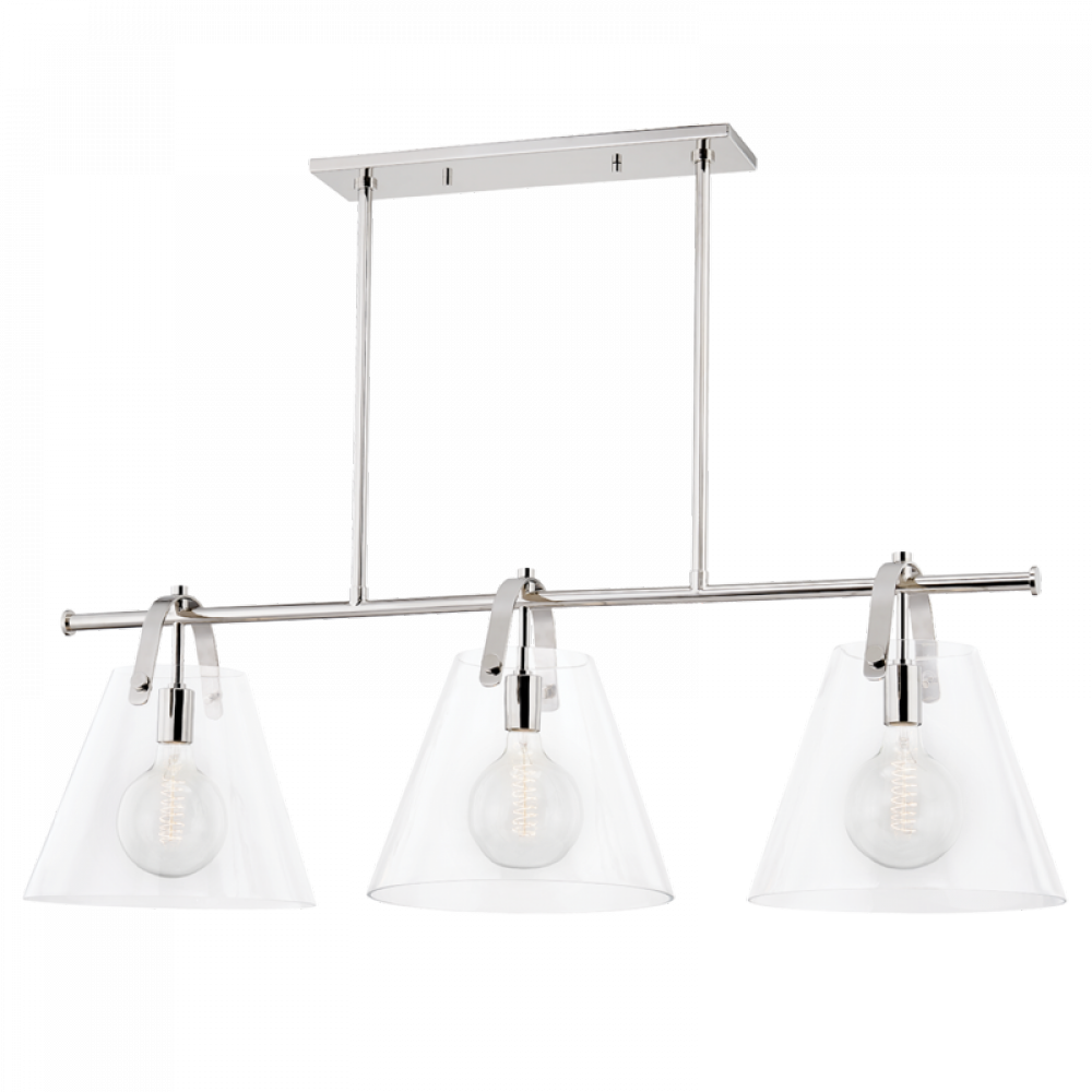 A metal strap arches over the open-top shade of this bell-shaped fixture that rings with style. An incandescent bulb shines through the clear glass shade—adding lots of light anywhere the linear, sconce or pendant is placed.
