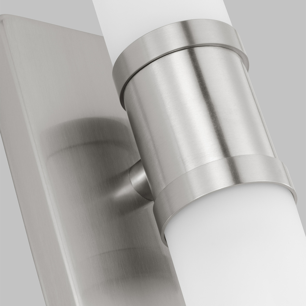 Sleek and modern, this 2-Light bath series pairs a square backplate with tubular etched white opal glass shade. The Keaton two light vanity fixture in brushed nickel silver provides abundant light for your bath vanity, while adding a layer of today's style to your interior design.
