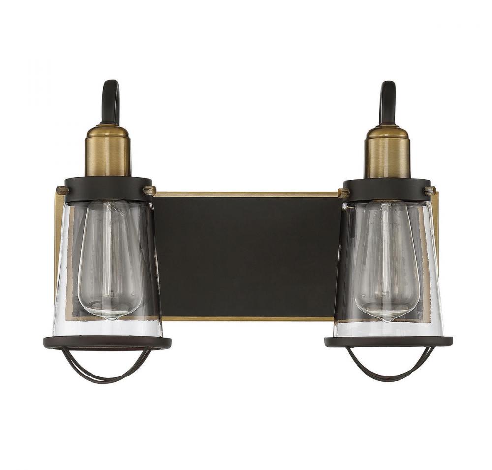 Industrial-inspired design, like this Savoy House Lansing 2-light bath bar, brings a vintage look to your home. The classic style is an excellent fit with industrial chic, modern farmhouse, urban loft, transitional and eclectic decor. This bath bar features a sturdy rectangular wall plate, curved light arms and cage-like details on the shade. The entire frame has a beautiful English bronze finish with bright warm brass accents. The slim tapered shades are made of clear glass, allowing the light from two 60W standard size bulbs to shine above your vanity. This fixture is 13.5" wide, 10" high and extends 7" from the wall. It's an impeccable choice for vintage industrial elegance in your bathroom or powder room.