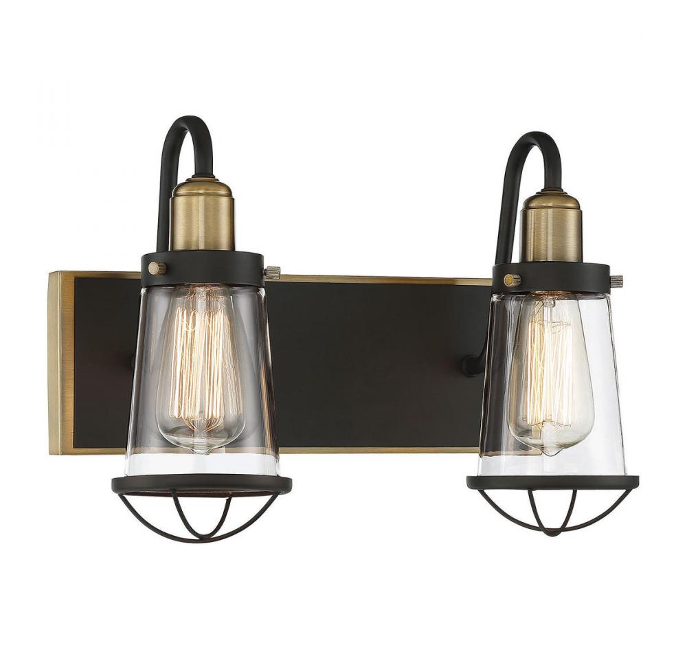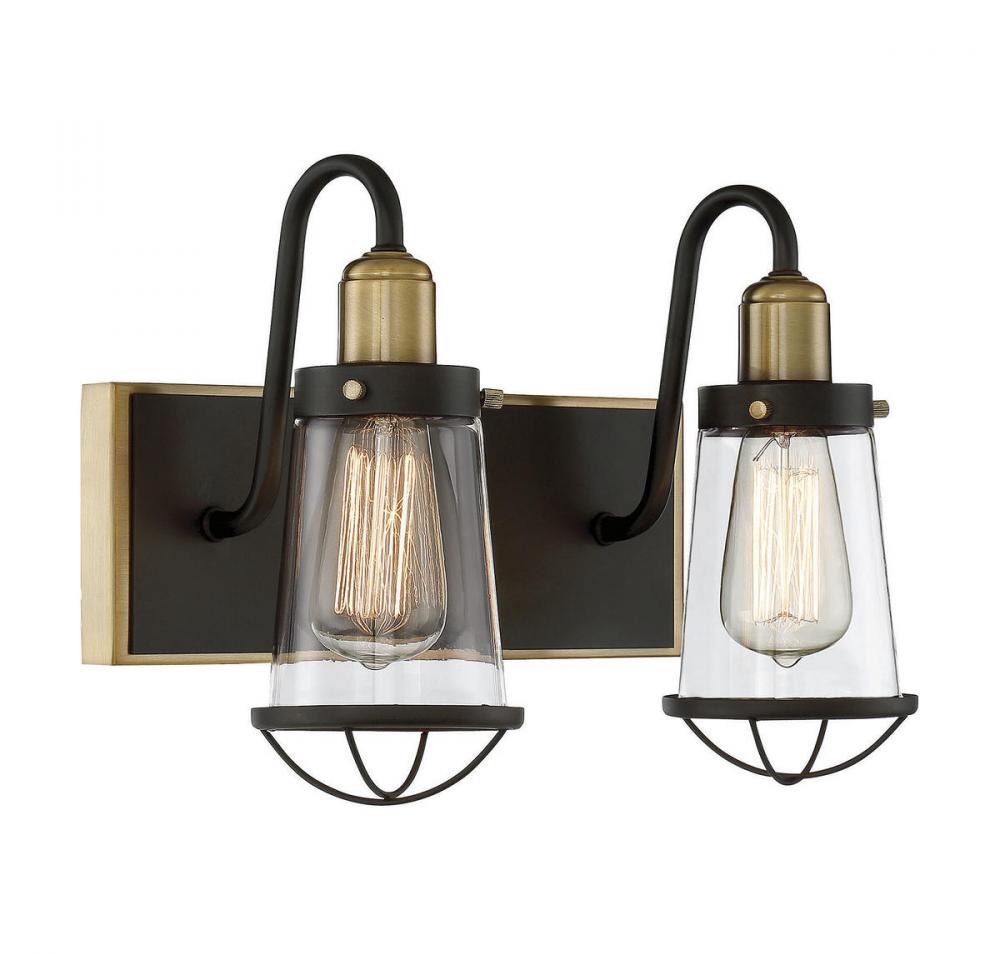 Industrial-inspired design, like this Lansing bath bar, brings a solid, practical, and vintage aesthetic to your home. The classic style is an excellent fit with industrial chic, modern farmhouse, urban loft, transitional, and eclectic decor. This bath bar features a sturdy rectangular wall plate, curved light arms, and cage-like details on the shade. And the entire frame has a beautiful, dark, English bronze finish with bright, warm brass accents. The slim tapered shades are made of clean, clear glass, allowing the light from two 60W, E-style bulbs to shine above your vanity. This fixture is 13.5β wide, 10β high, and extends 7β from the wall. Itβs an impeccable choice for vintage industrial elegance in your bathroom or powder room.