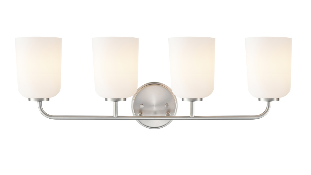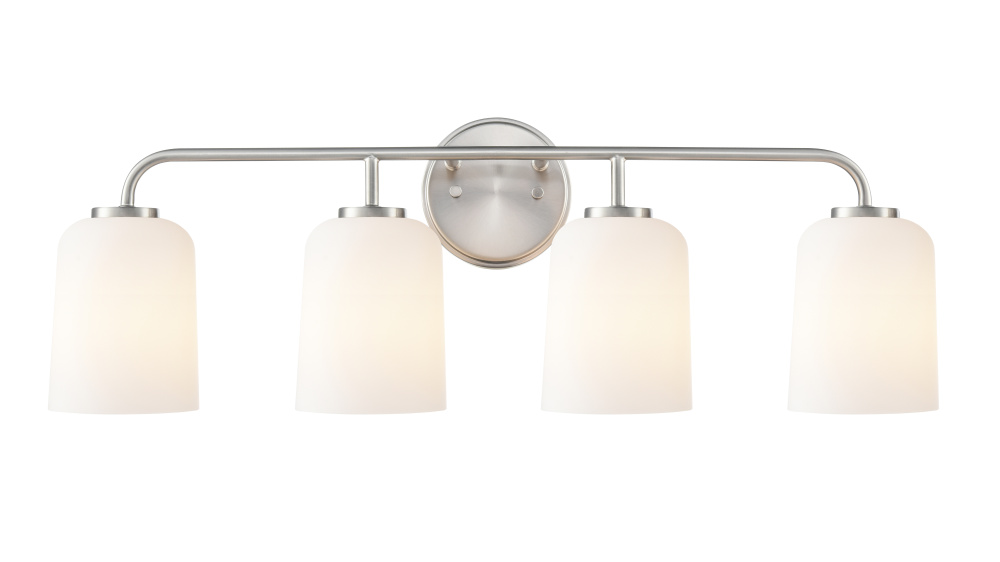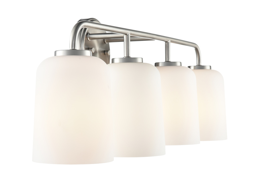 The Laphia Family features sleek lines, a graceful profile, and brilliant white, bell-shaped glass shades creating an ambient glow. The Family is available as sconce, chandelier, pendant, mini-pendant, semi-flush mount, flush mount, and an excellent vanity task light. Perfect for any interior plan from Craftsmen to modern farmhouse, these fixtures are finished in stylish brushed nickel, matte black, or modern gold.