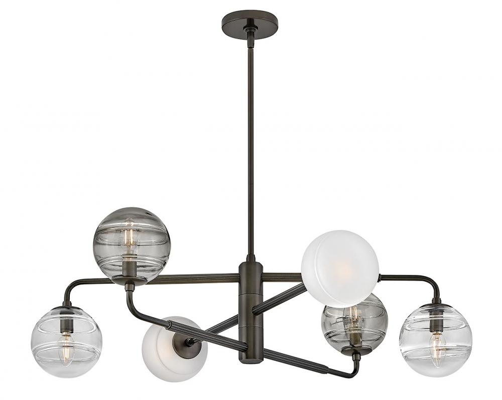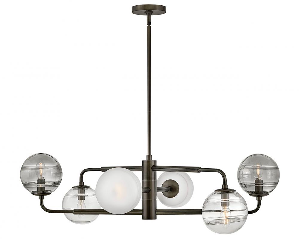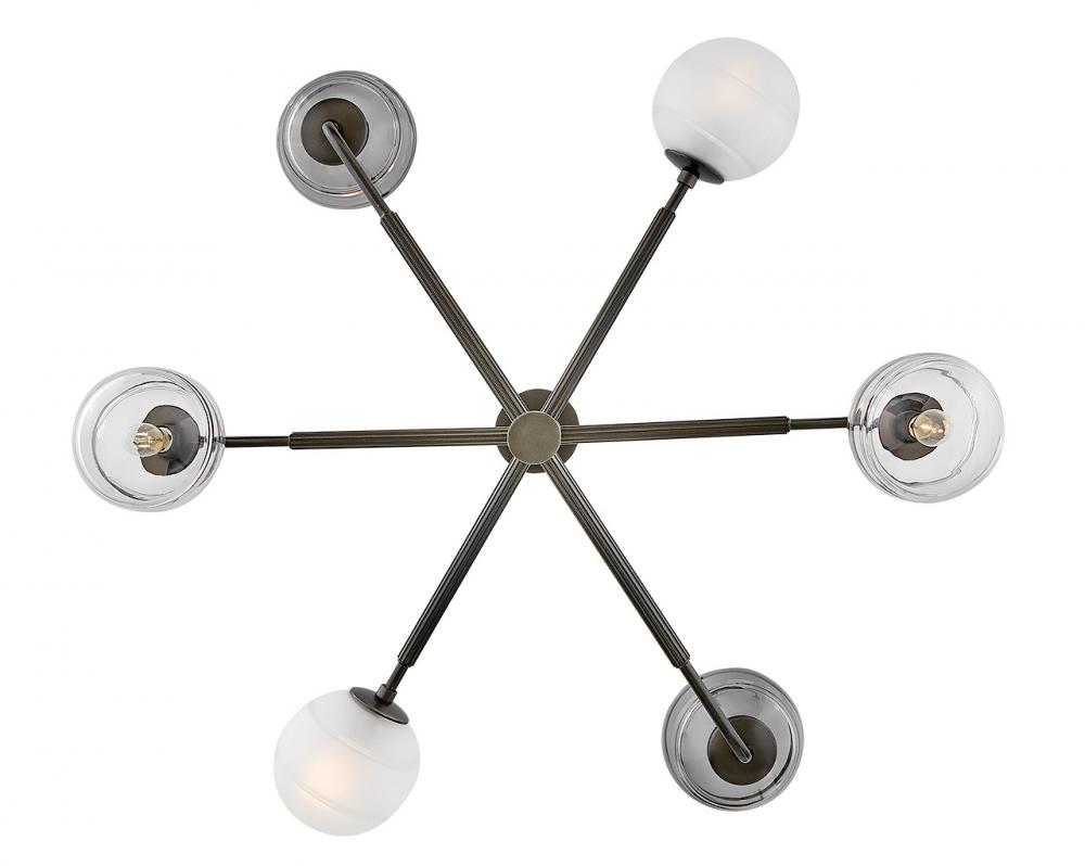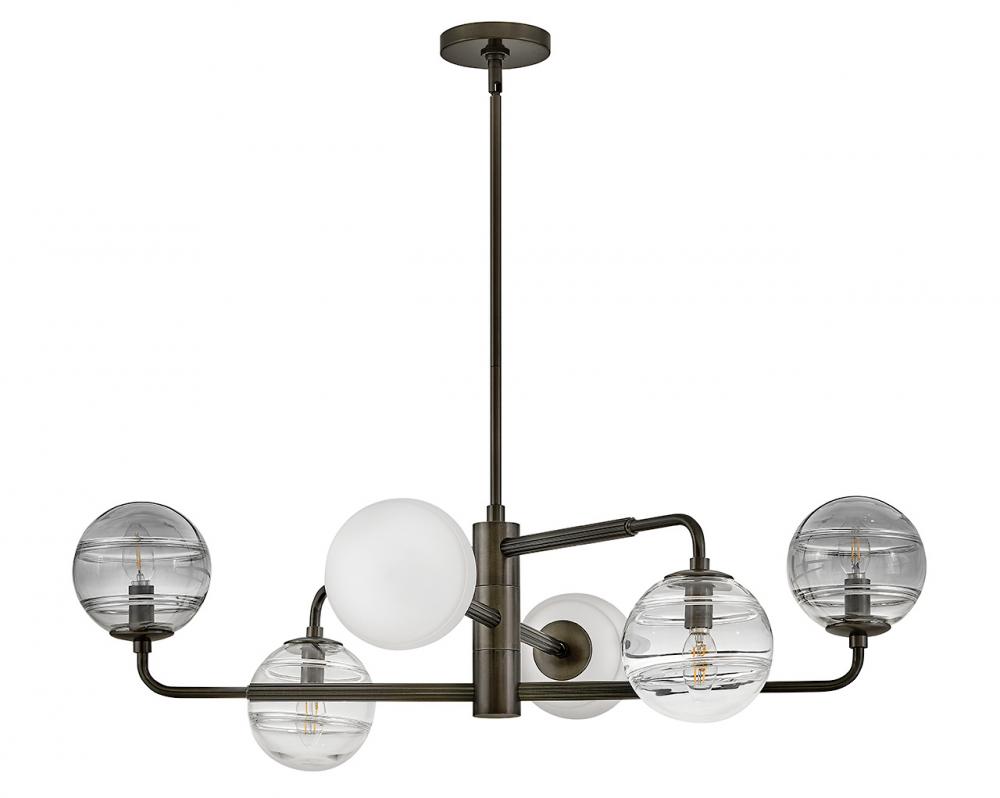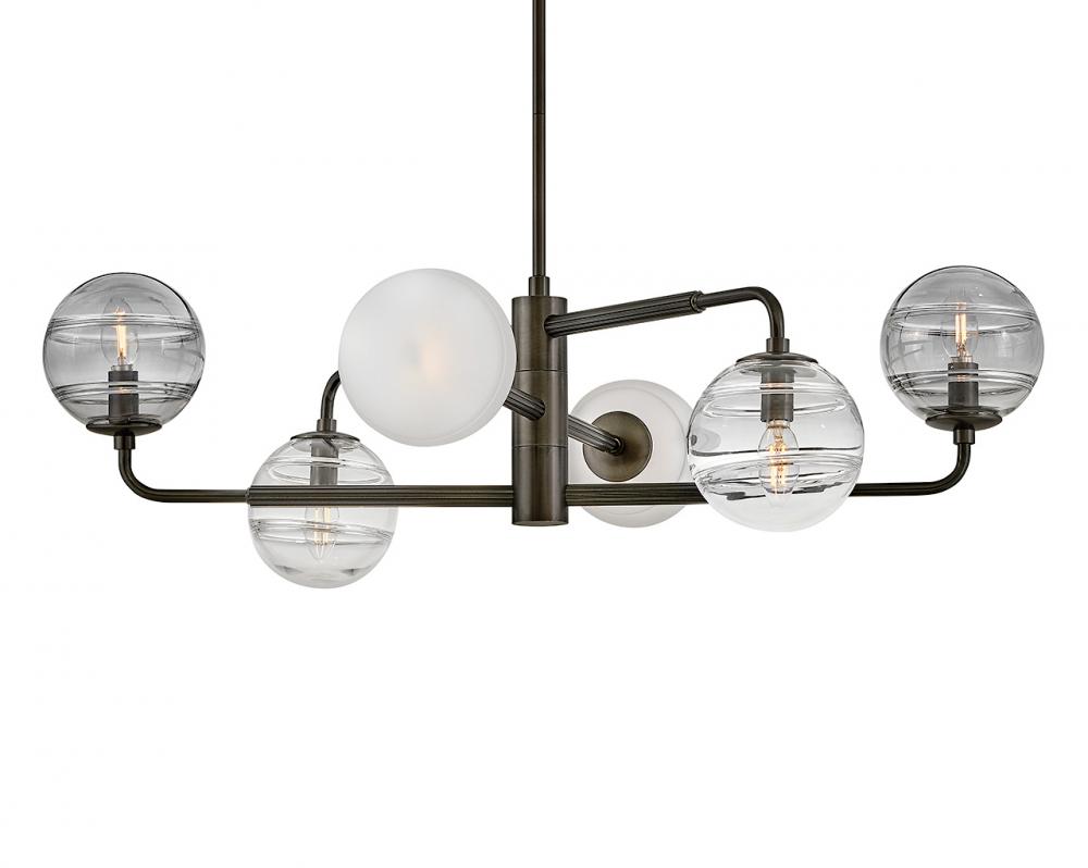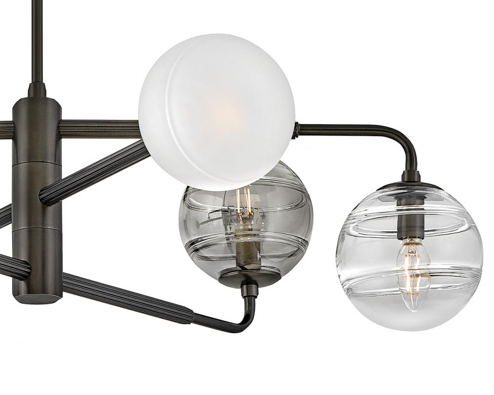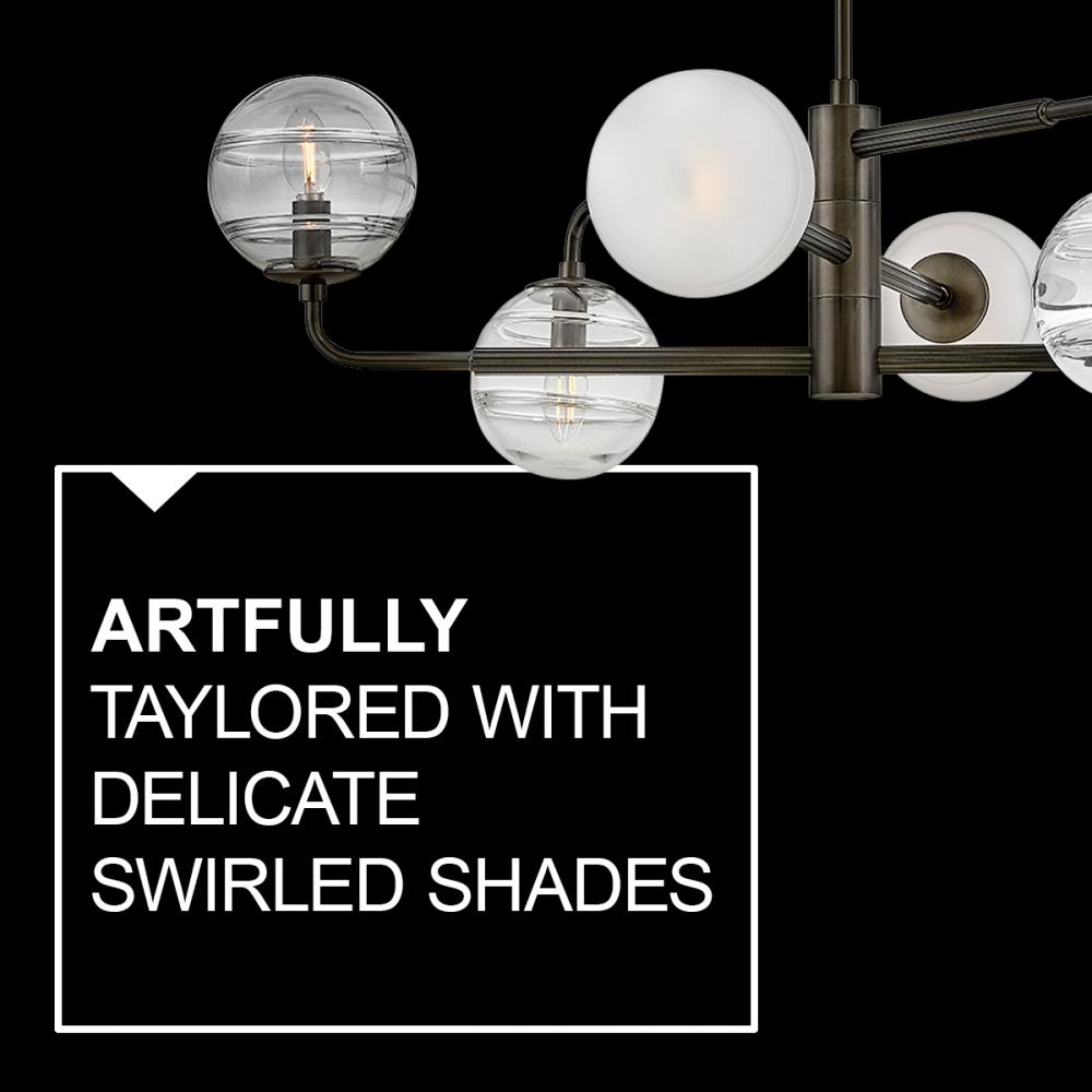 Artfully combining unexpected materials and innovative technology, Oberon's ribbed stems and articulating arms in Black Oxide allow for a tailored, transitional silhouette. Delicate swirls detail spherical shades in amber, clear, and smoke glass.