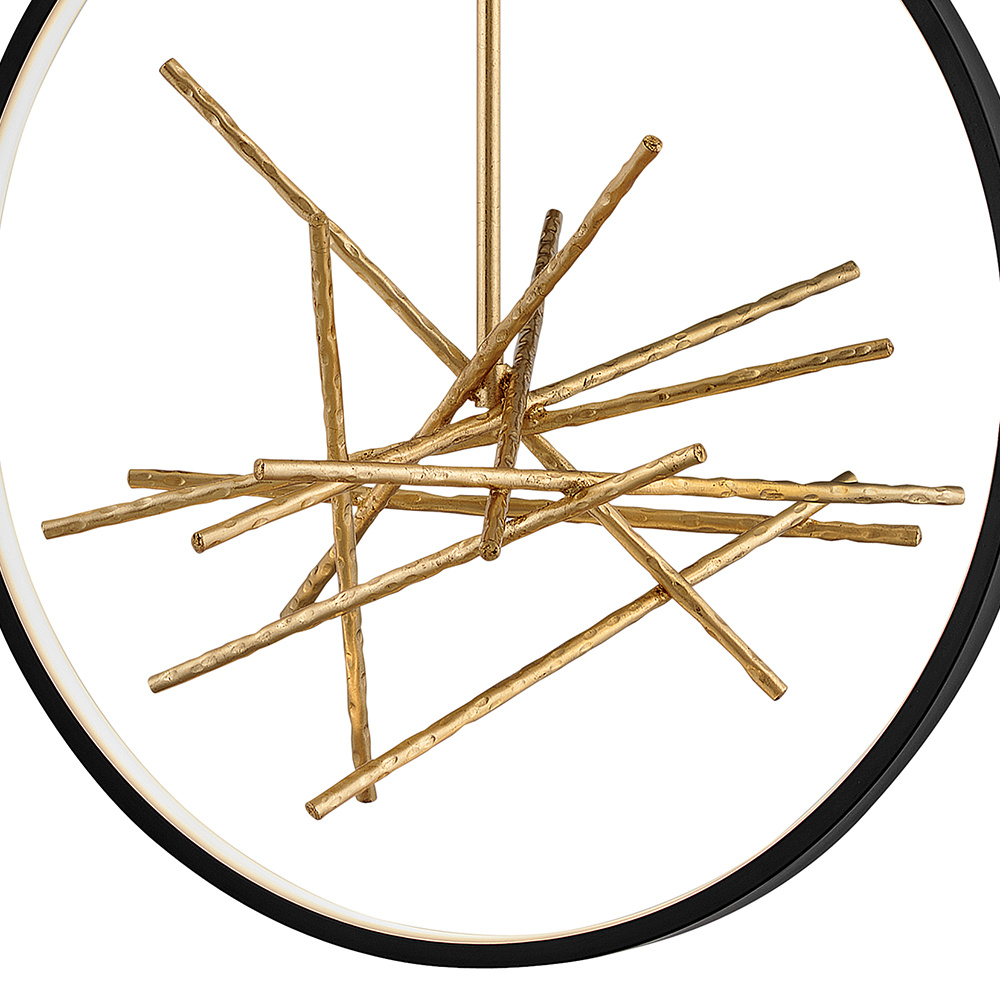 The breathtaking design of Styx fuses rich glamour with modern styling for an enthralling and dynamic silhouette with unexpected elements. An integrated LED open frame is fully dimmable, composed of clean angles in a chic Black finish. The frame illuminates textured metal branches in Gilded Gold, mingling organic and contemporary elements.