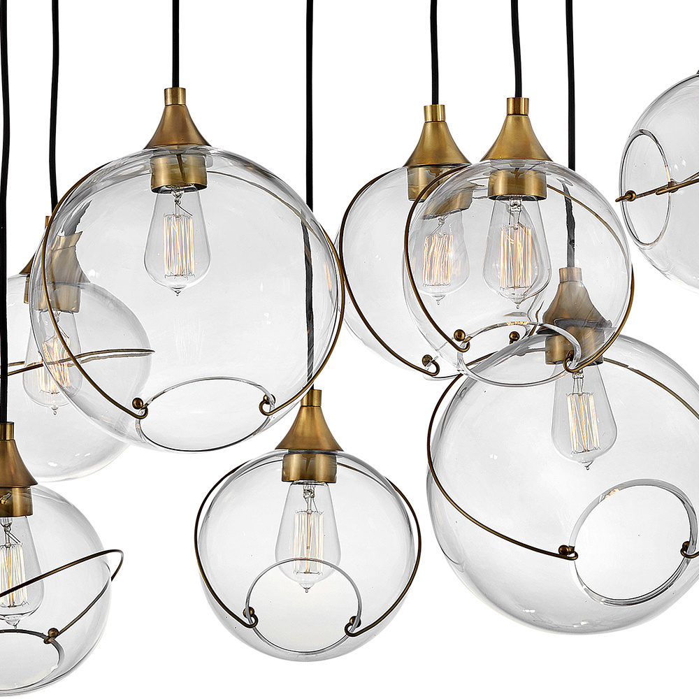 Mesmerizingly asymmetrical with a mid-century modern flair, Skye showcases a single or cluster of glass globes, each encircled with a slender ring. Each opening is off-center and the globes fall to different lengths, with Heritage Brass or Black details pulling the look together perfectly.