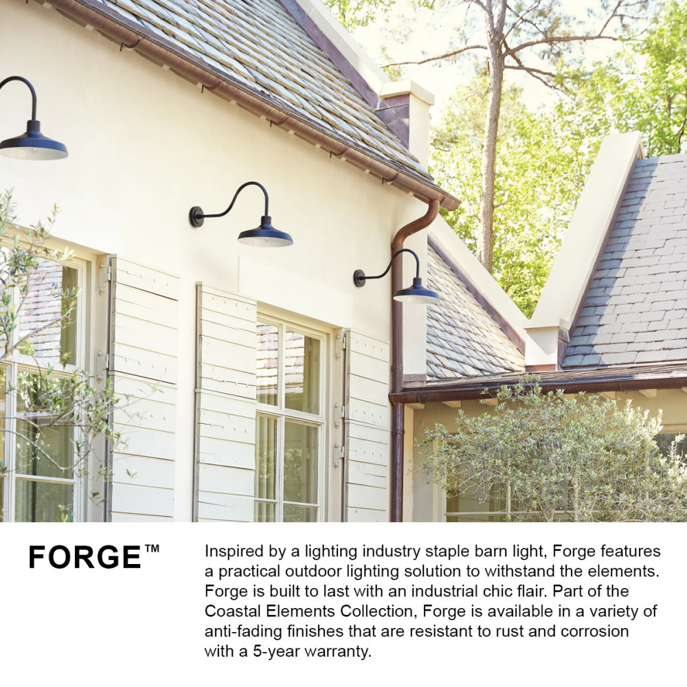 Inspired by a lighting industry staple barn light, Forge features a practical outdoor lighting solution to withstand the elements. Whether it is enduring harsh sunrays, extreme cold or continuous salt air, Forge is built to last with an industrial chic flair. Part of the Coastal Elements Collection, Forge is available in a variety of anti-fading finishes that are resistant to rust and corrosion with a 5-year warranty.
