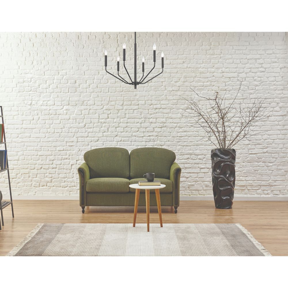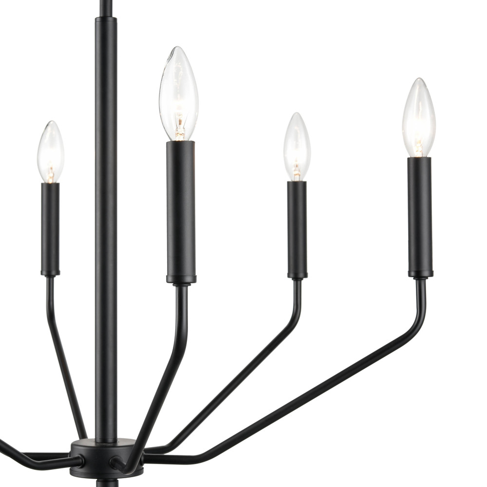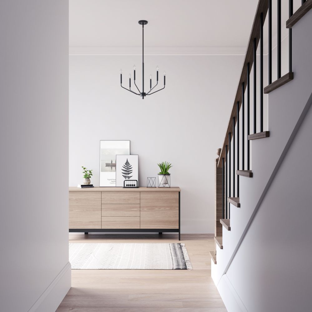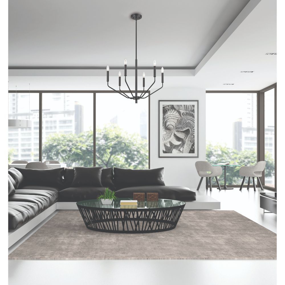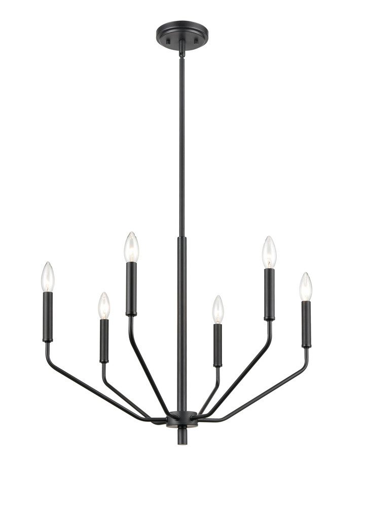 A contemporary twist on the classic Gothic design, this 60w six-light chandelier measures 24” x 18 3/8” and is available in a matte black and modern gold finish. The uniquely angled arms provide a distinctive look designed to beautifully enhance any interior space.